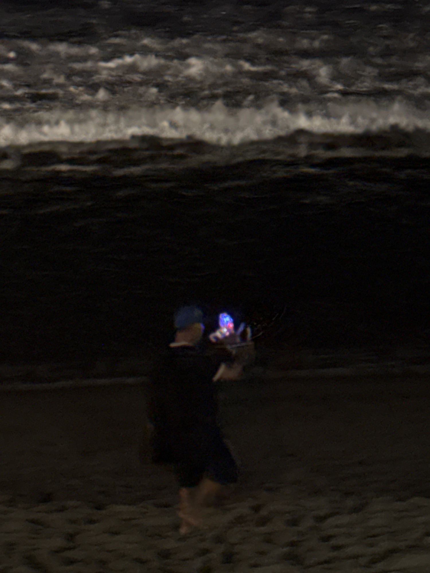 At night in North Kuta, Indonesia, a person stands on the sandy beach near the ocean's edge. The ocean is visible on the left. The person is wearing dark clothing and has an object with blue and red l…read more
