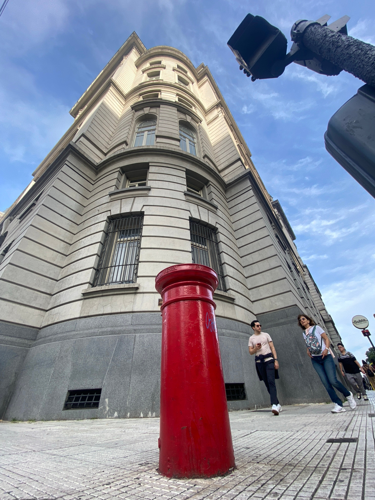 The image shows a low-angle view of a street scene in Buenos Aires, Argentina, featuring a red British-style post box. A tall, light-colored building with a curved facade and repeating horizontal archβ¦read more