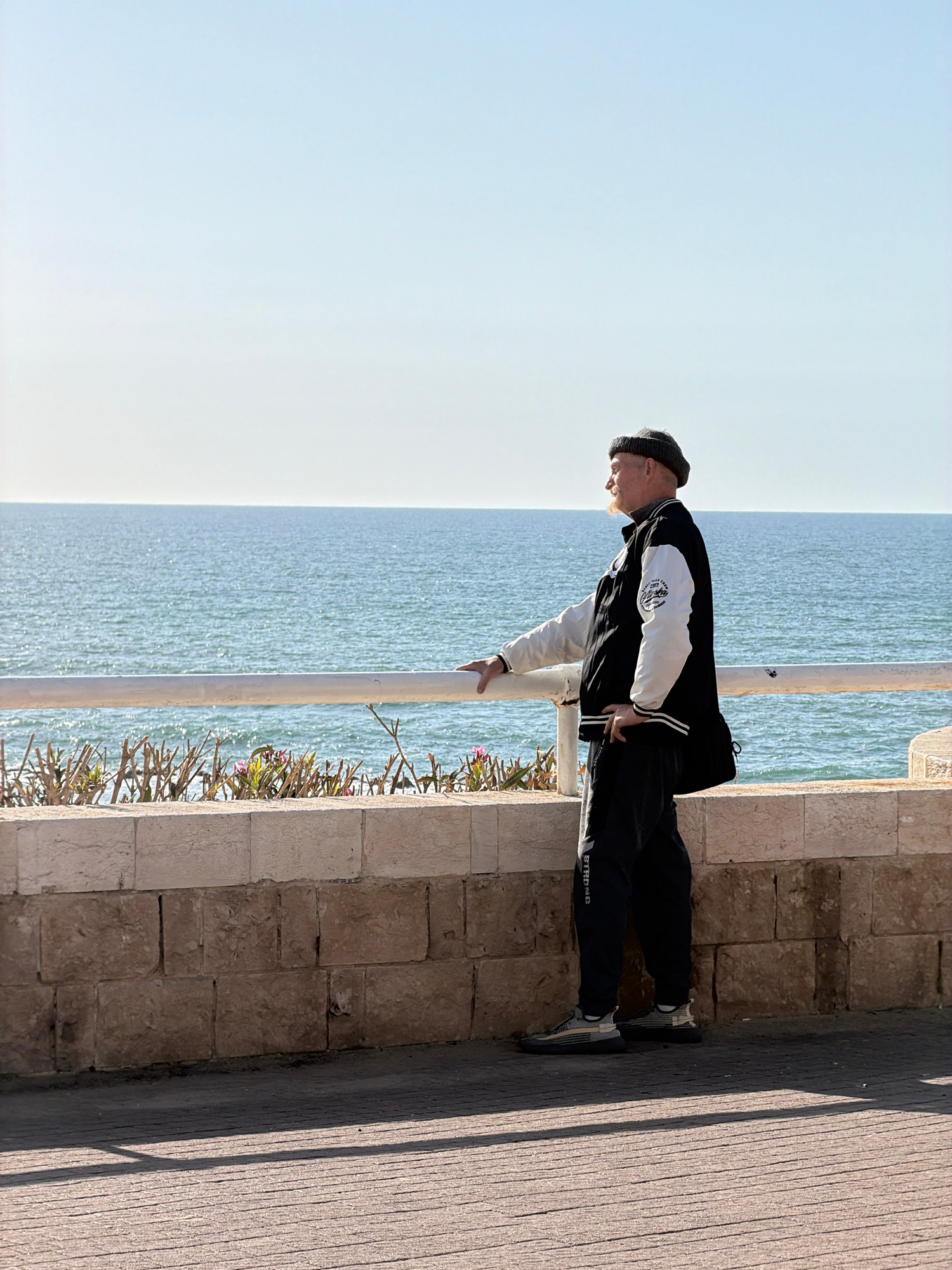 A man leans over a railing overlooking the sea. He wears a black beanie, a black and white jacket, and black sweatpants with the word "STRONG" down the side. His left hand is on the railing. The sea sā¦read more