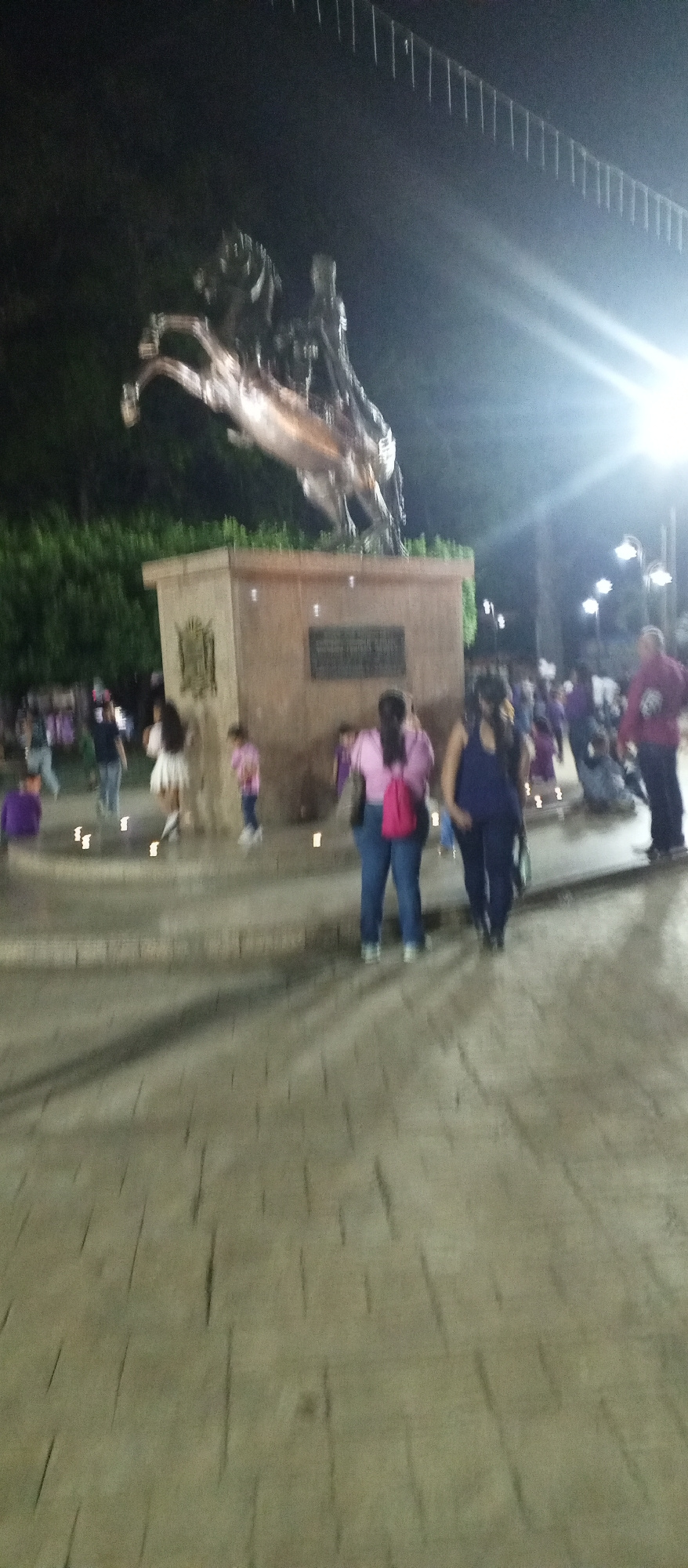 At night in Tinaquillo, Venezuela, a bronze statue of a man on horseback is the focal point of a gathering. The statue stands on a stone pedestal in a plaza. People are milling about, and many small c…read more