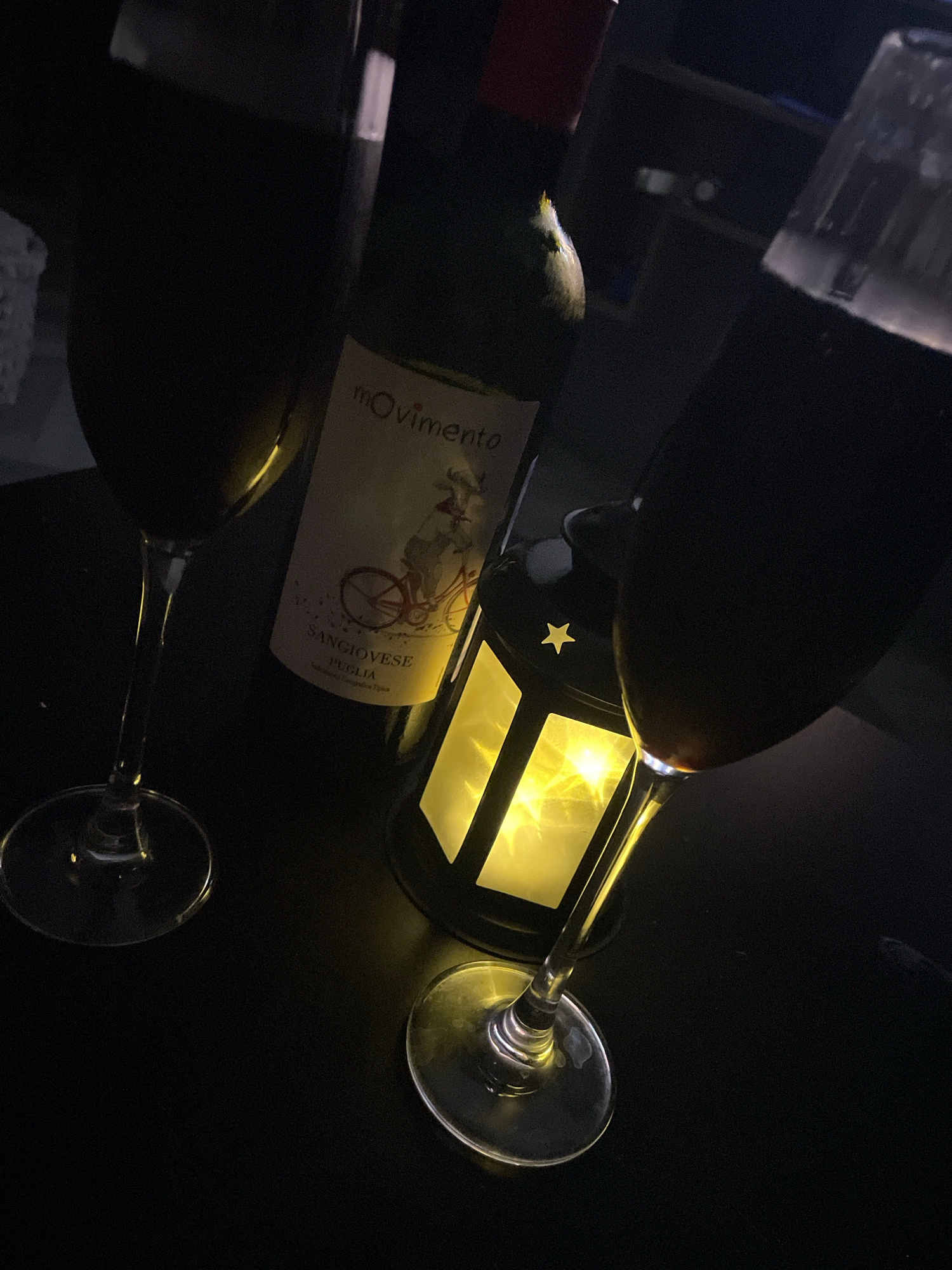 The image shows a still life arrangement on a dark surface. A wine bottle labeled "Movimento" with a depiction of a figure on a bicycle is positioned horizontally. Two wine glasses, partially filled w…read more