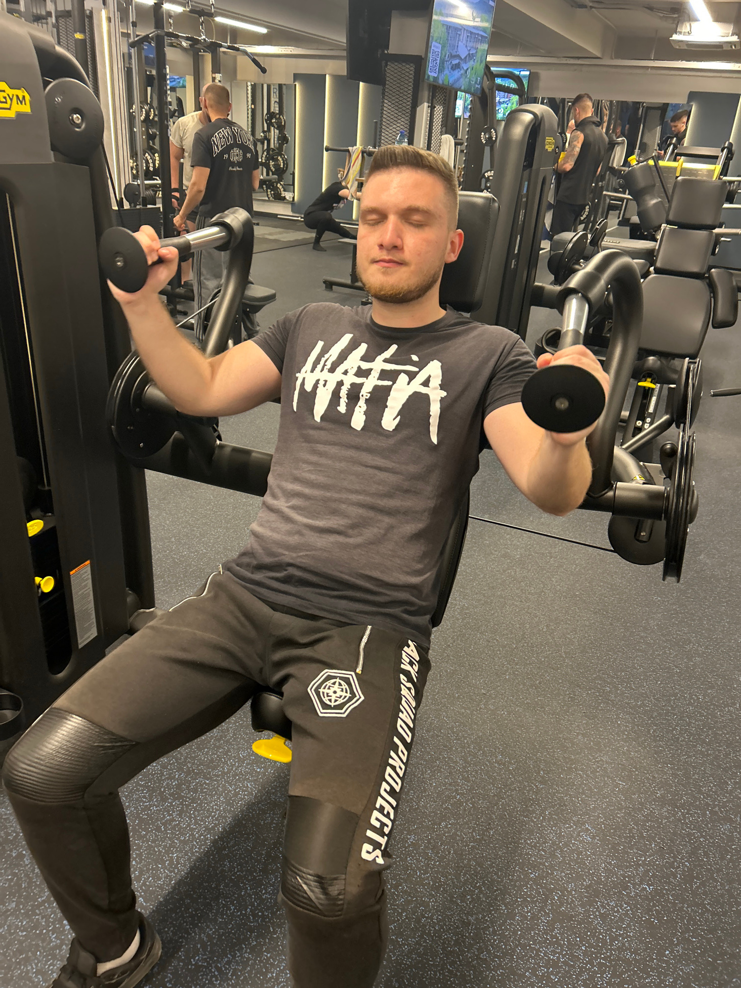 The image shows a man in a gym using a chest fly machine. He is wearing a gray t-shirt with a white design and black pants with a logo and text on the right leg that says "ACK SQUAD PROJECTS". He is sā¦read more