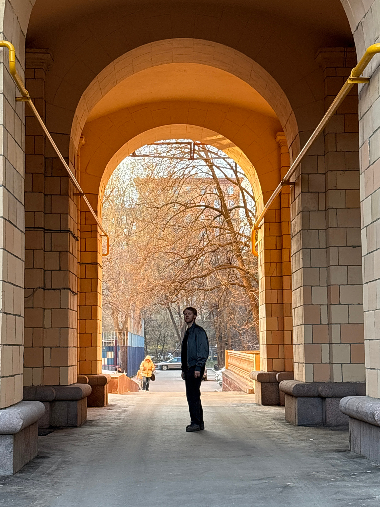 A man stands in a long archway of brick and concrete in Moscow, Russia, on a clear day. The archway has a large, curved opening at the far end through which bare trees are visible. A second person is…read more