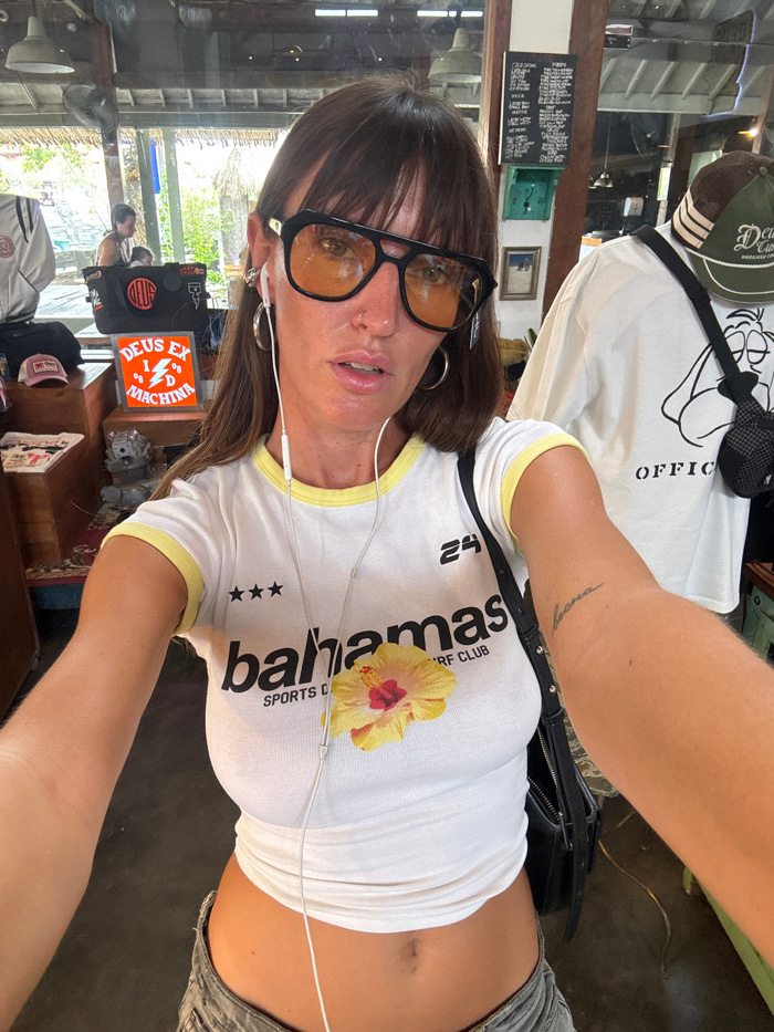A woman with dark hair, bangs, and yellow-tinted glasses poses close to the camera wearing a white t-shirt with yellow trim, a floral design, and “Bahamas” printed on the front. She has headphones in…read more