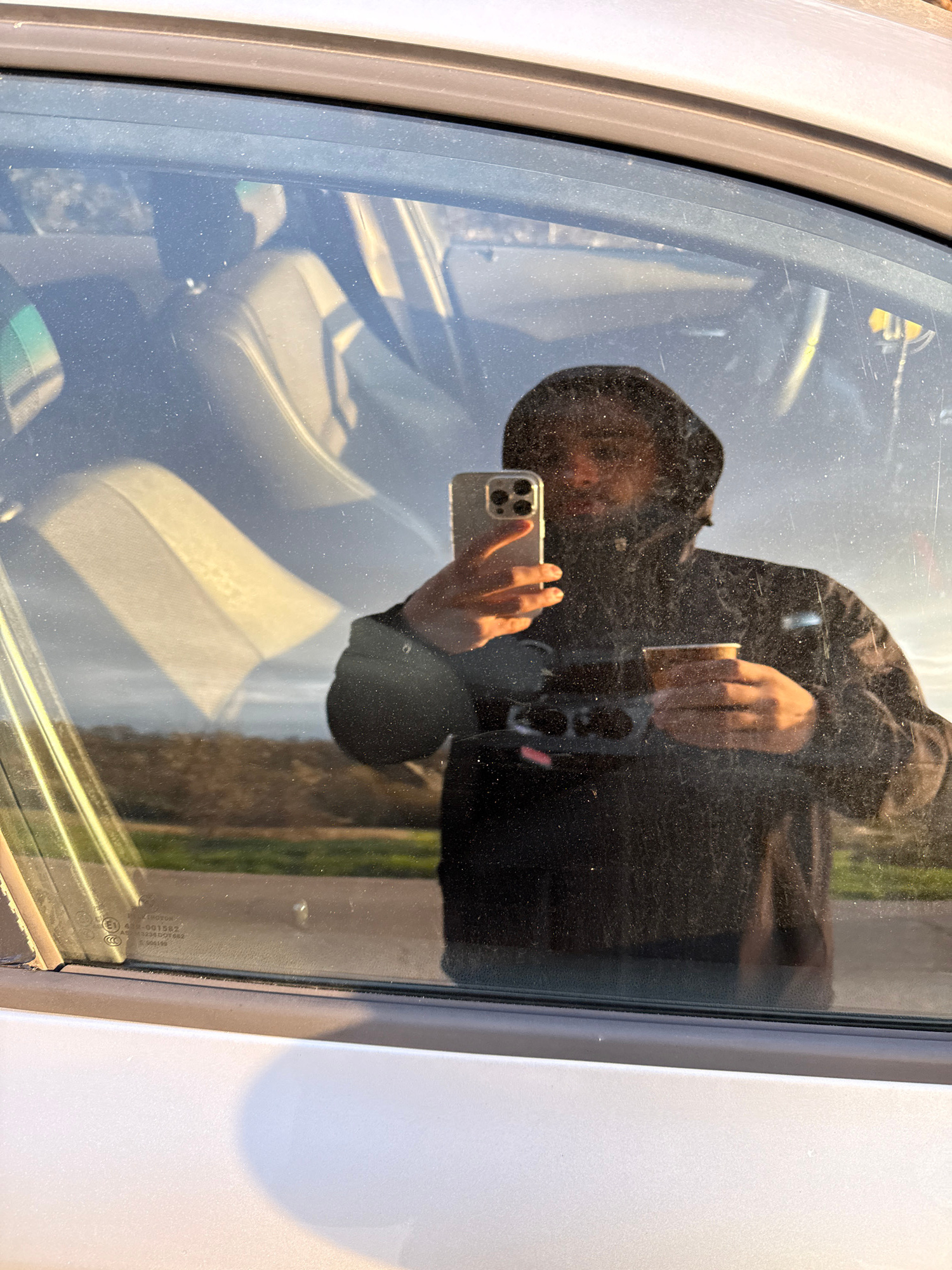 The image shows a reflection in a car window. The reflection depicts a person holding a smartphone, likely taking the photograph. The car's interior, including the seats and steering wheel, is visible…read more