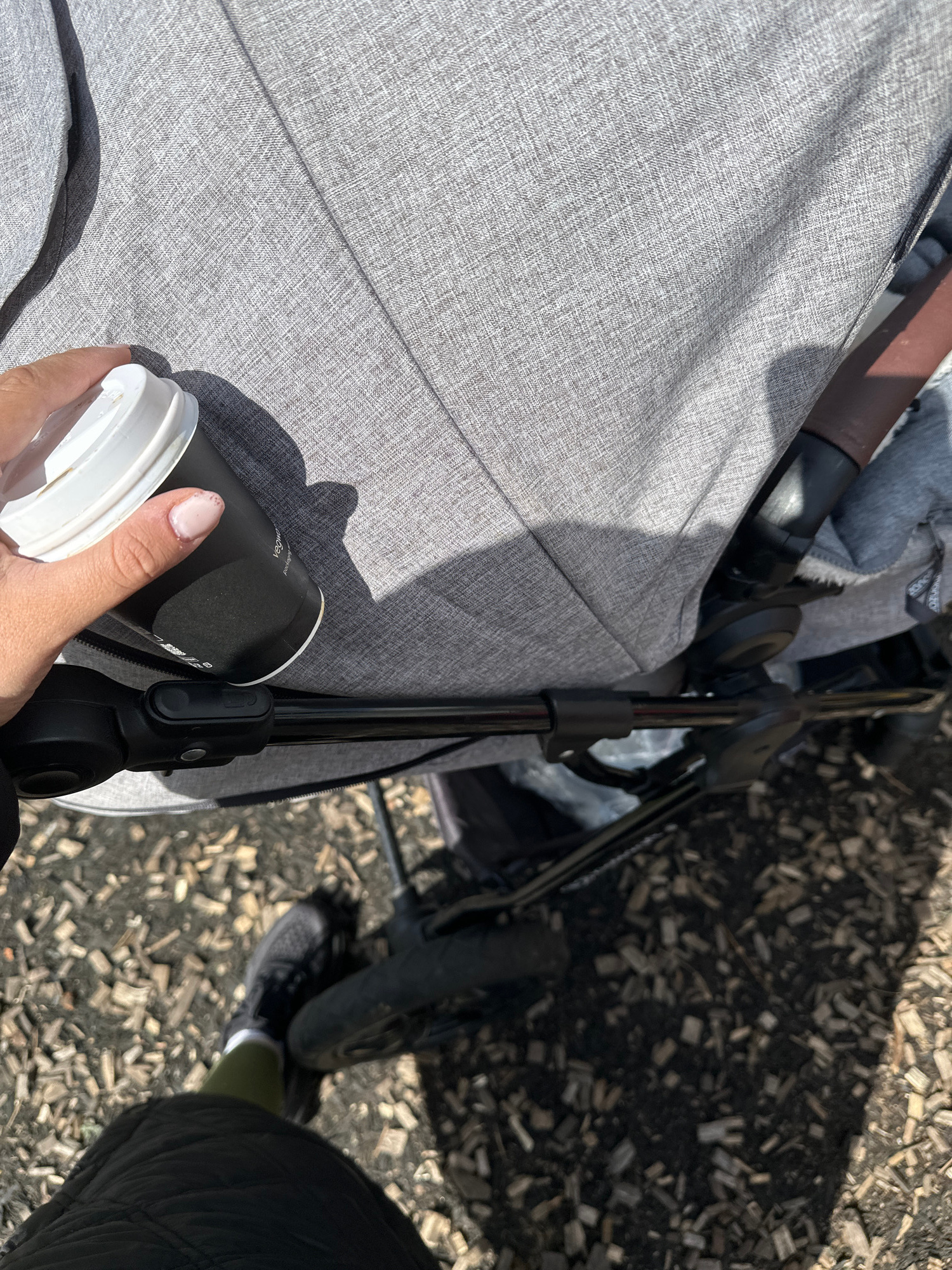 The image is a first-person perspective shot from above, likely taken while sitting in a stroller. The foreground is dominated by the grey fabric of the stroller's seat and sides. A hand holding a blaβ¦read more