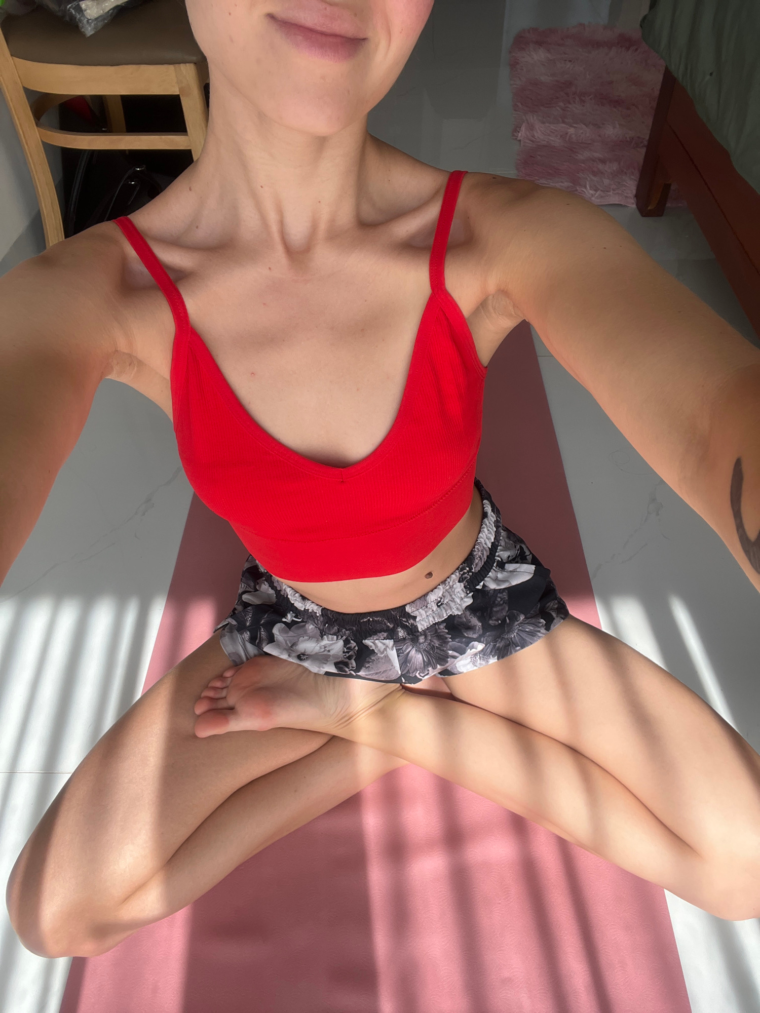 A woman in a red top and black and white floral shorts sits cross-legged on a pink yoga mat on a white tile floor. Sunlight streams through blinds, casting shadows across her body and the mat. The wom…read more