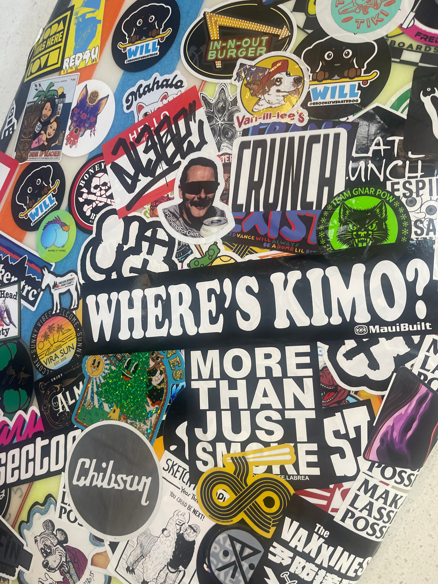 The image displays a close-up, slightly angled view of a surface, likely a surfboard or skateboard, completely covered with a dense collage of various stickers. The surface itself appears to be white…read more