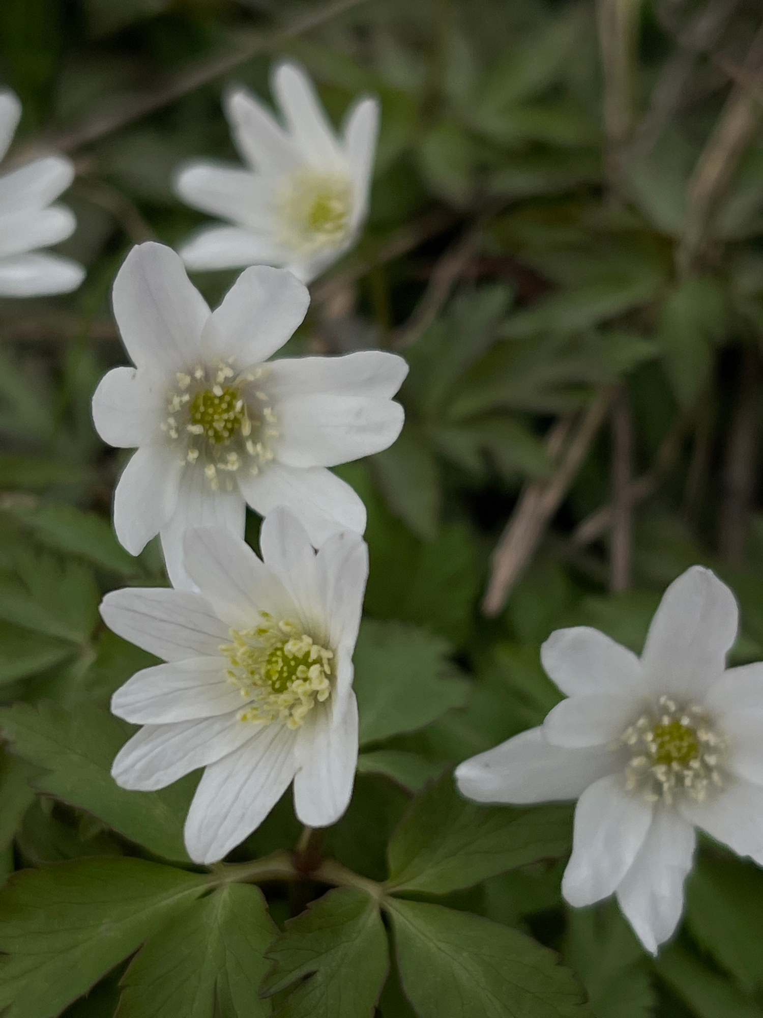 The image shows a close-up view of several white flowers with yellow centers surrounded by green leaves. The flowers have six petals each. The background is blurred, suggesting the focus is on the flo…read more