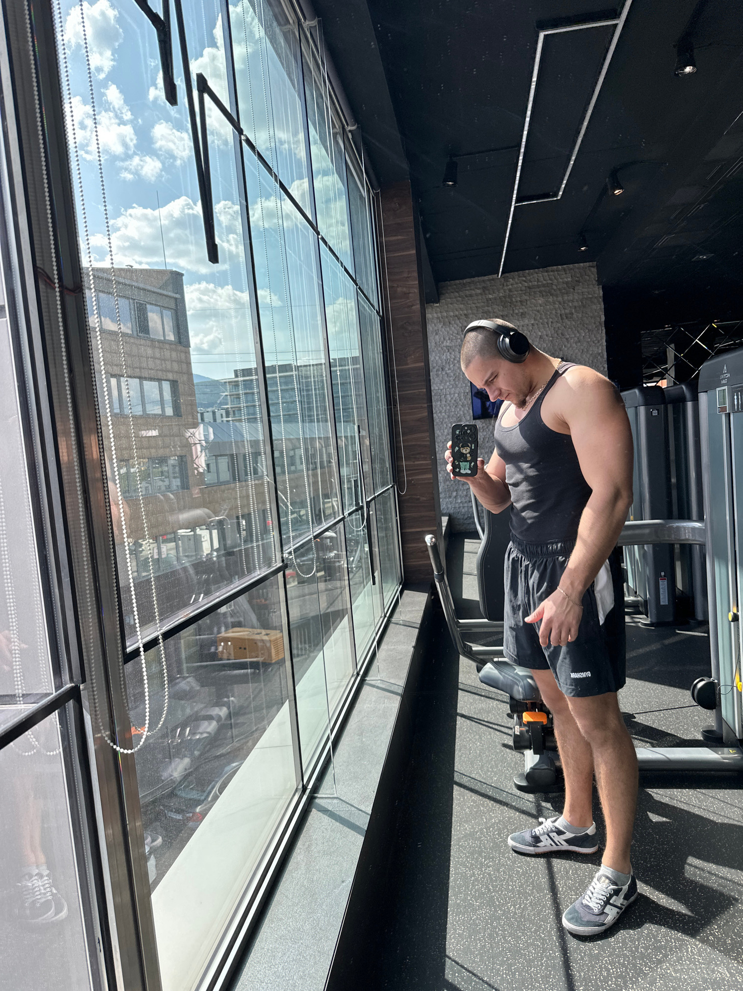 The image depicts a man standing in what appears to be a gym or fitness center in Sofia, Bulgaria. He is seen from the waist up, facing slightly left, looking down at his smartphone. He is wearing a d…read more
