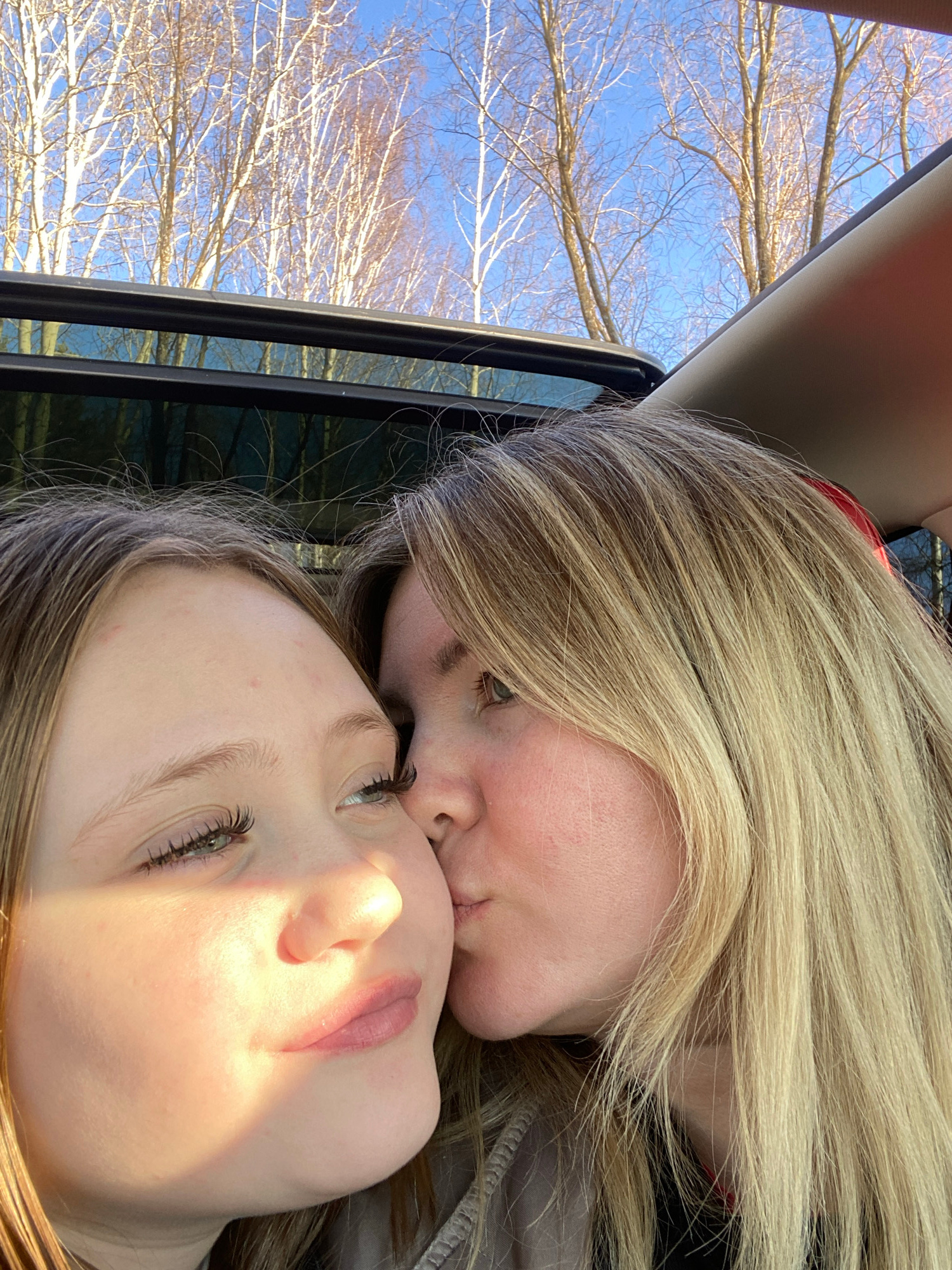 An intimate moment is captured inside a vehicle, featuring two individuals, likely two females, in close embrace. The image is oriented horizontally, with the subjects' faces close together. An indivi…read more