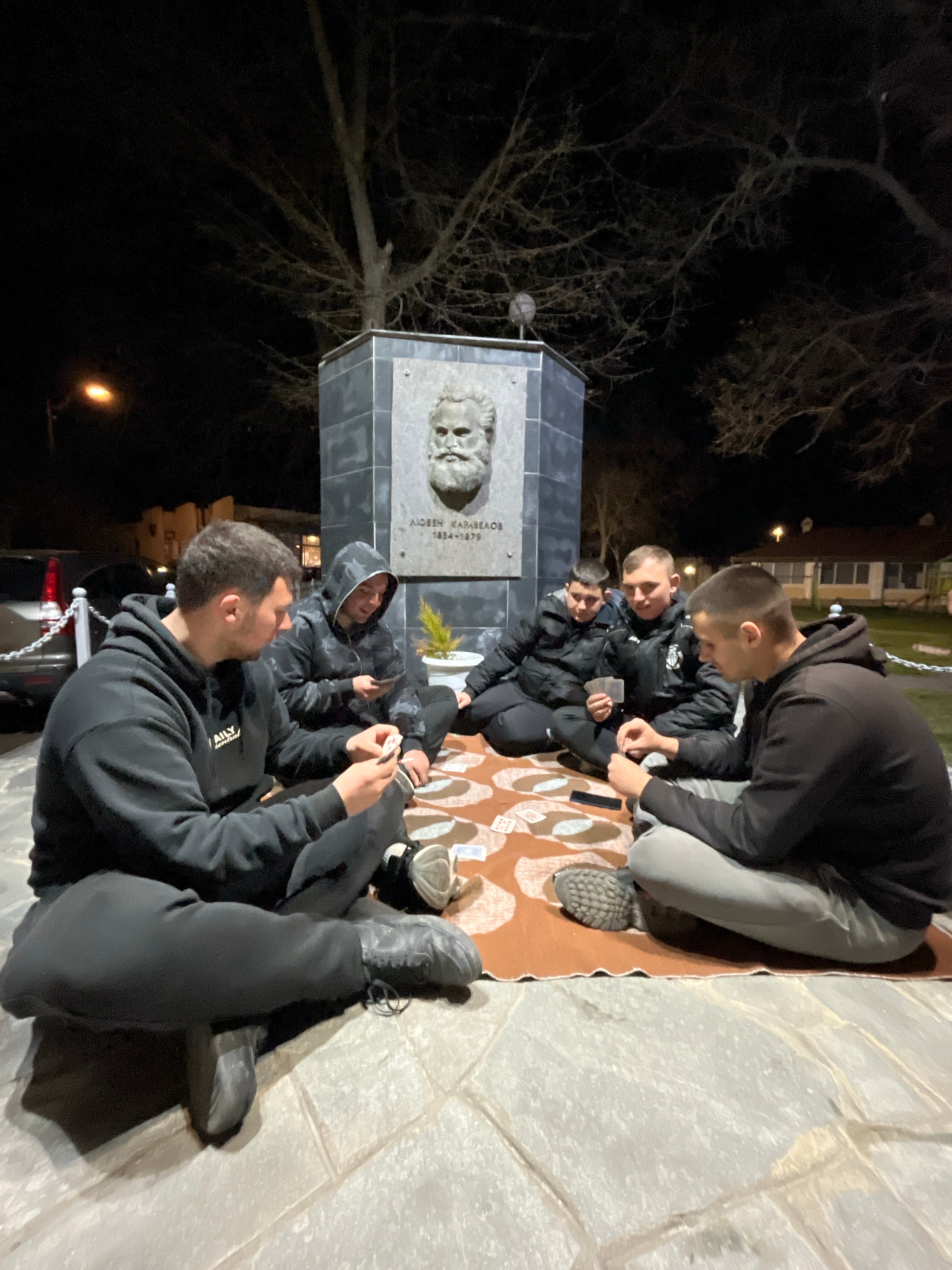 A group of six individuals are gathered at night in the city of Karavelovo, Bulgaria, sitting on a blanket on the ground in front of the monument of Lyuben Karavelov. The individuals are playing cards…read more