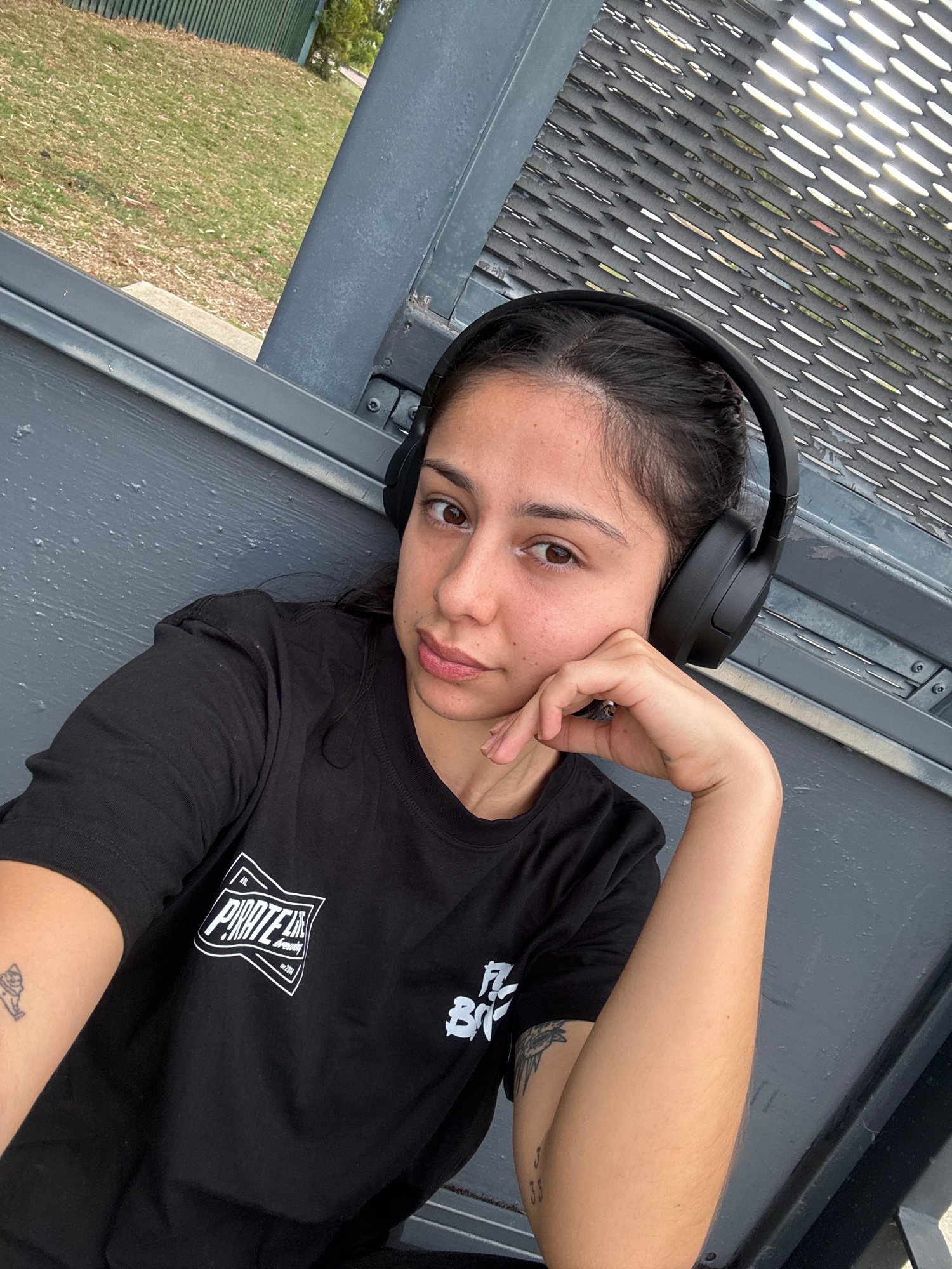 The image shows a young woman resting against a dark grey or black metal structure, likely a fence or railing, in an outdoor setting in Bicton, Australia, during daylight hours. She has dark hair, bro…read more