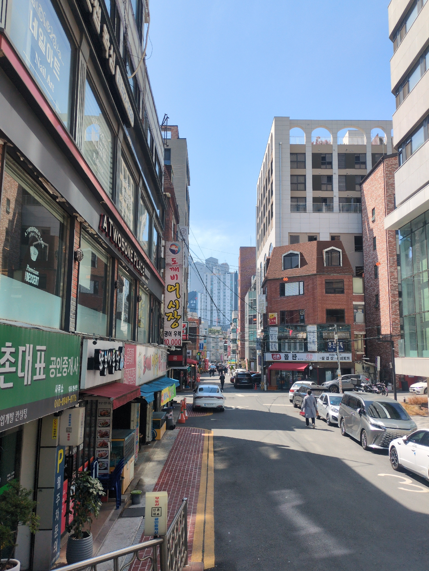 This image depicts a street scene in Seoul, South Korea. The view is along a street lined with buildings, showcasing a blend of architectural styles, from modern high-rises to brick buildings. The str…read more