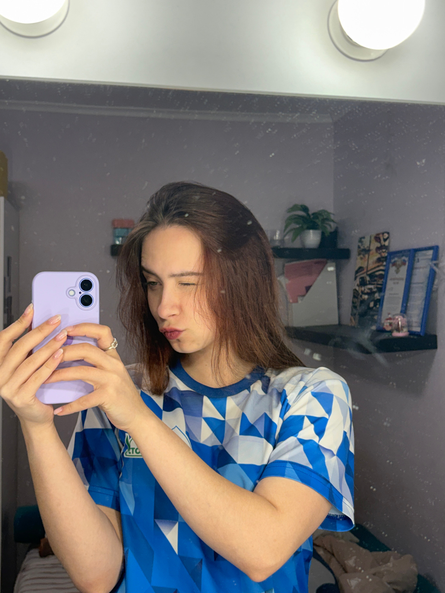 A woman is taking a selfie in front of a mirror. She is holding a purple smartphone. She is wearing a blue shirt with white geometric patterns. The mirror shows a reflection of a shelf with decoration…read more