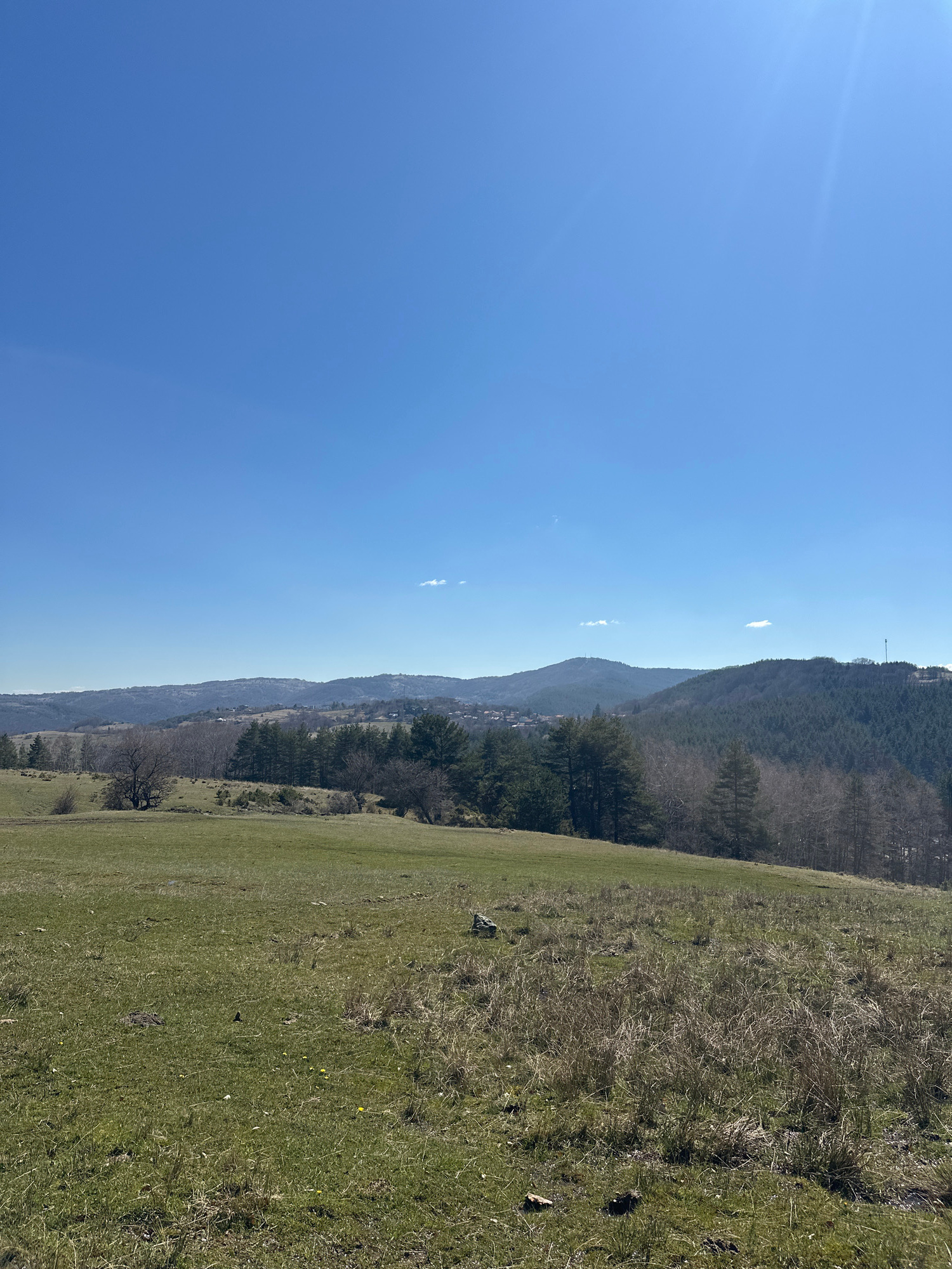The image shows a landscape scene likely located near Zheleznitsa, Bulgaria. The foreground consists of a grassy field, with a gradual slope upwards. In the middle distance, there are forested hills a…read more