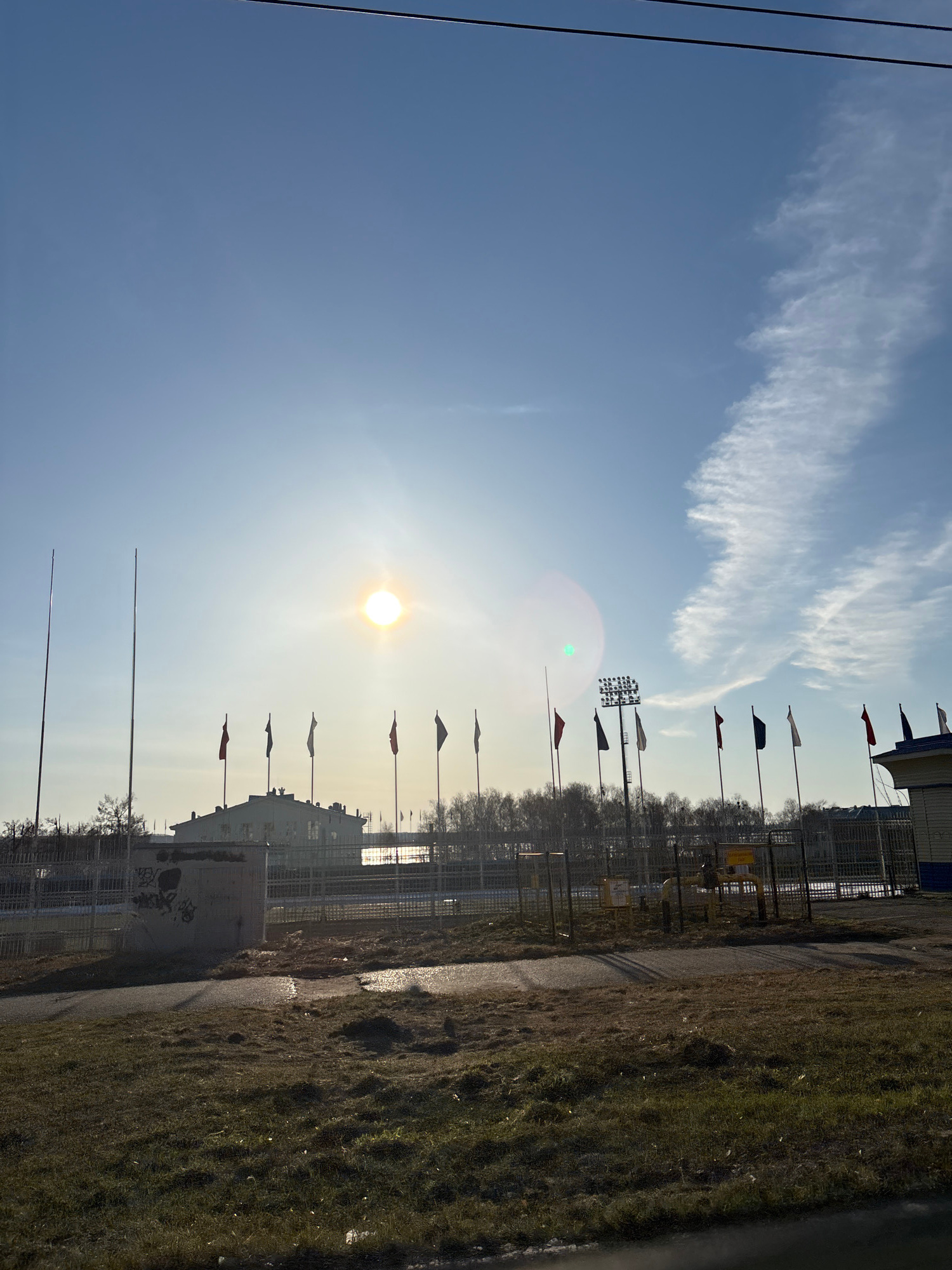 This is an outdoor, horizontally oriented image captured on a bright, sunny day, likely in Votkinsk, Russia. The sky dominates the upper portion of the frame, displaying a clear, light blue hue with a…read more