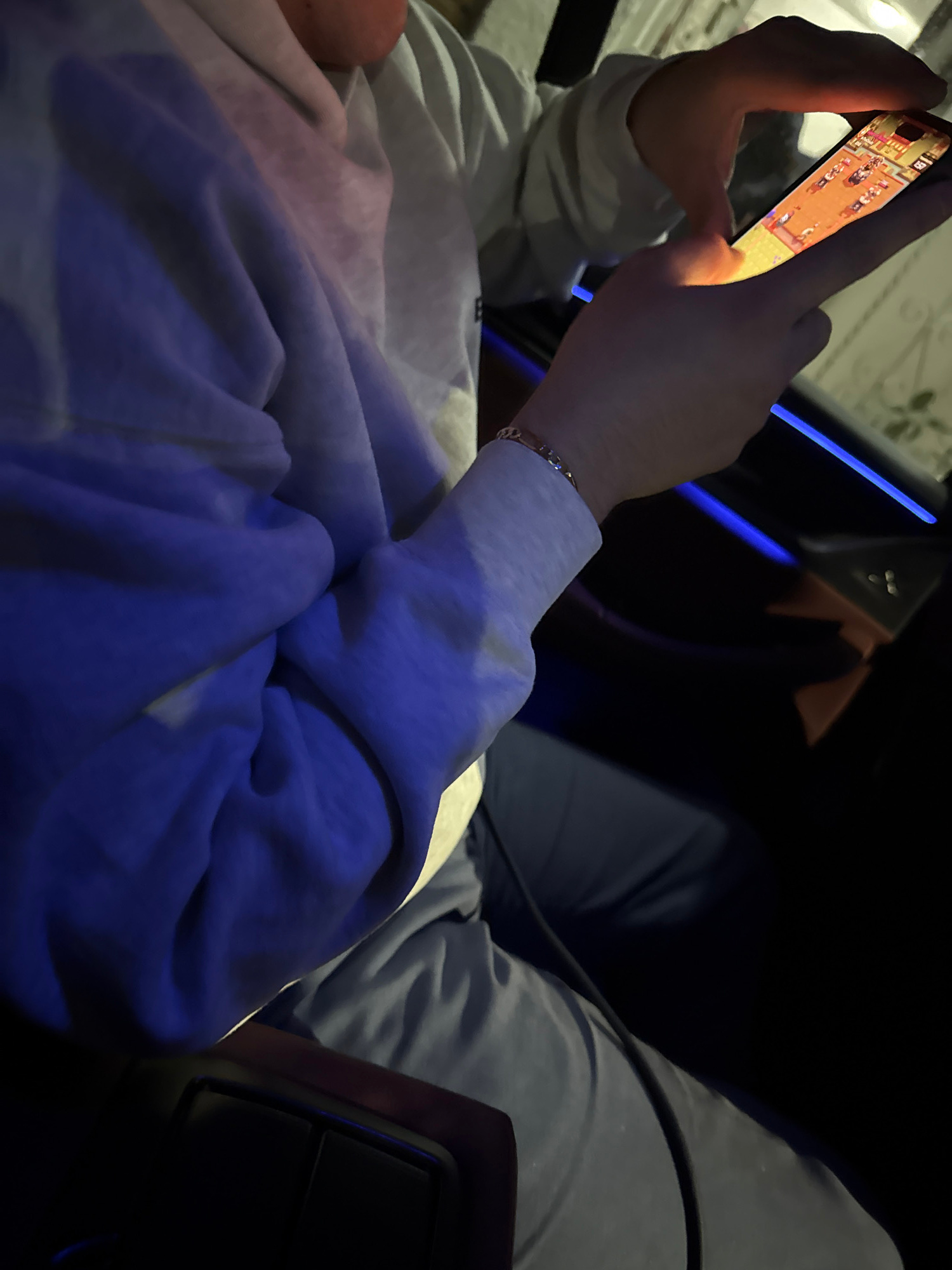 An individual is depicted from the upper torso to the upper legs, seated in what appears to be a vehicle interior at night in San Bernardino Tlaxcalancingo, Mexico. The person is wearing a light gray…read more