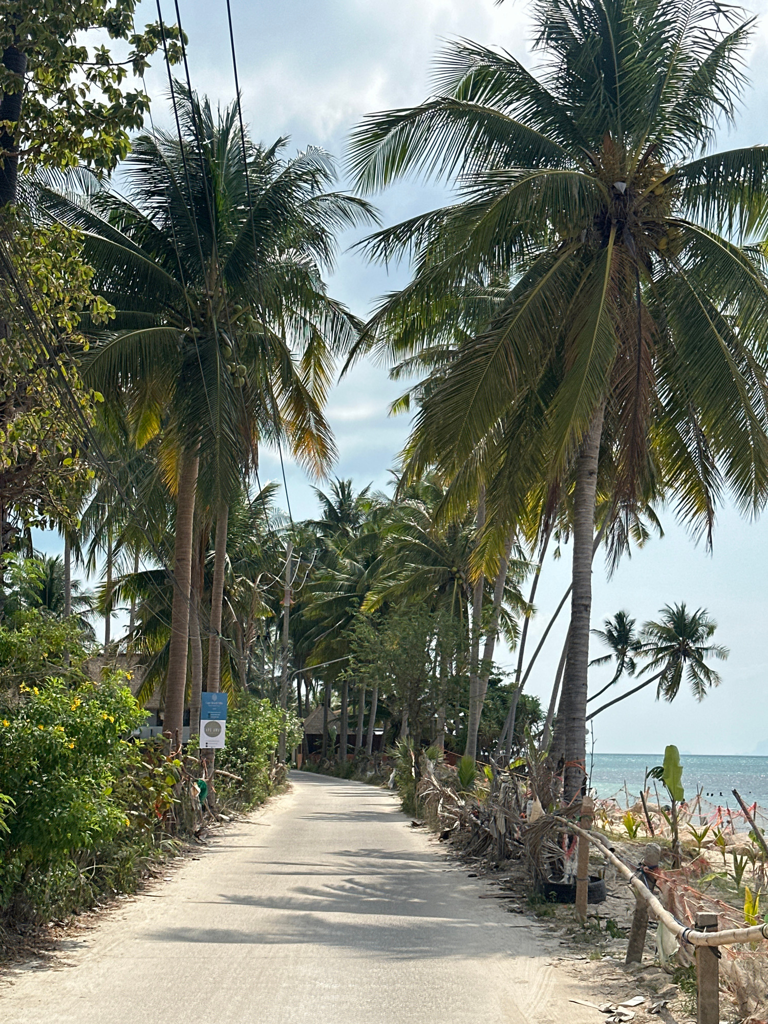 The image displays a sun-drenched, narrow concrete pathway winding through a tropical coastal setting. The path is bordered on both sides by abundant, lush green vegetation, dominated by numerous tall…read more
