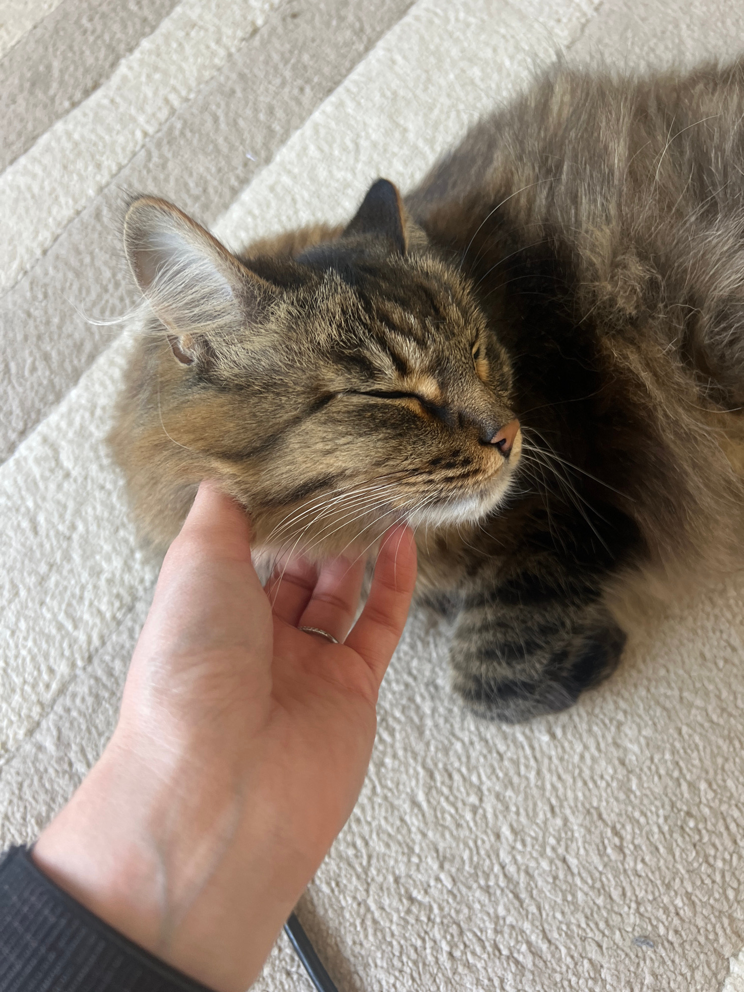 A medium-long haired brown tabby cat is lying on its back on a textured, light-colored surface, likely a rug or blanket. A fair-skinned human hand with a silver ring is gently touching the cat's neck.…read more