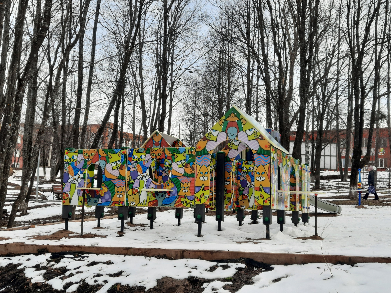 The image depicts a children's playground in Krasnogorskoye, Russia. The playground features a colorful structure adorned with cartoon cat illustrations. The structure consists of multiple panels arra…read more