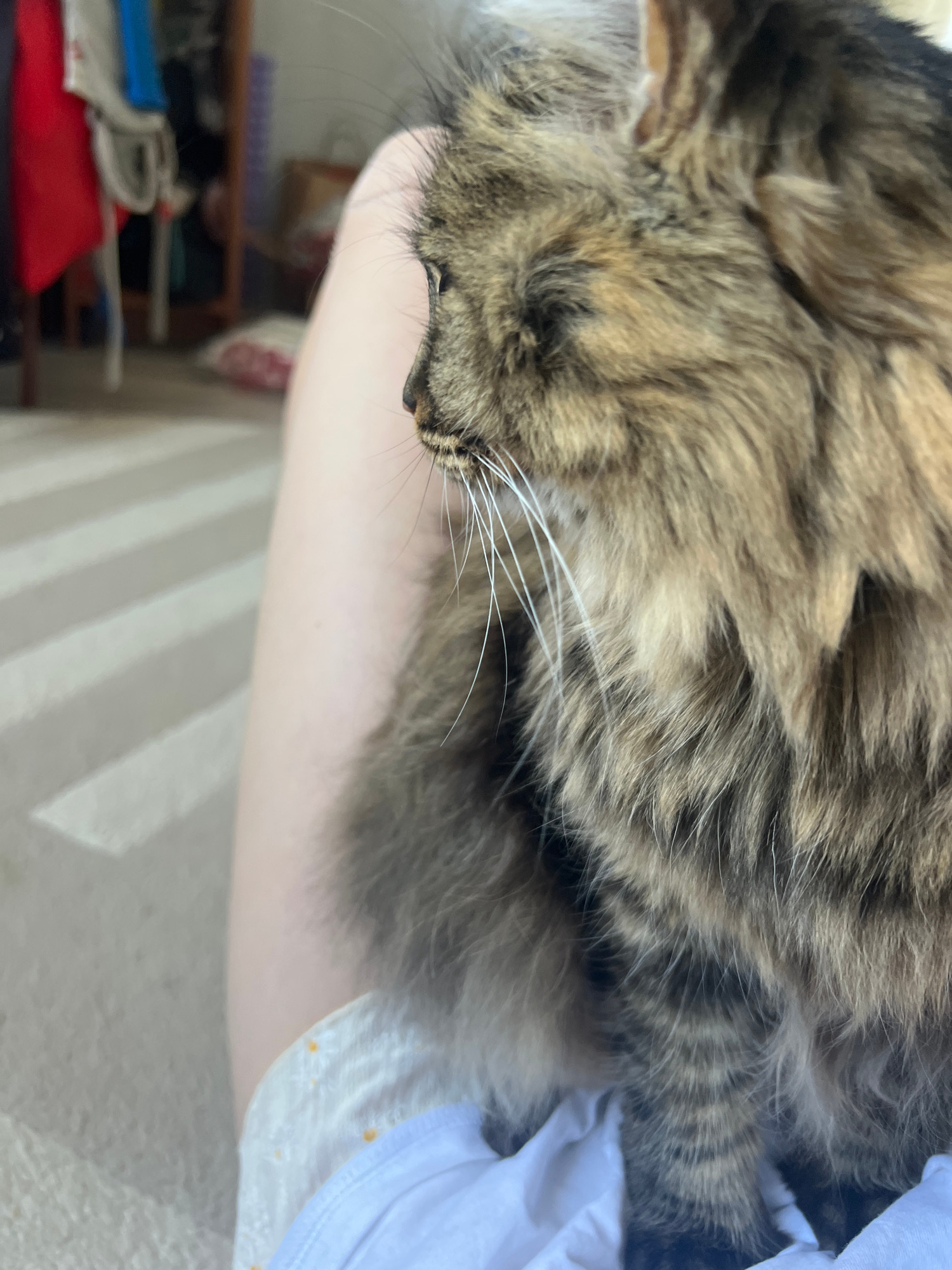 A close-up, rotated shot shows the upper portion of a brown tabby cat resting on a person's arm. The cat's face, with its long white whiskers, is angled slightly downward. The person is wearing a whit…read more