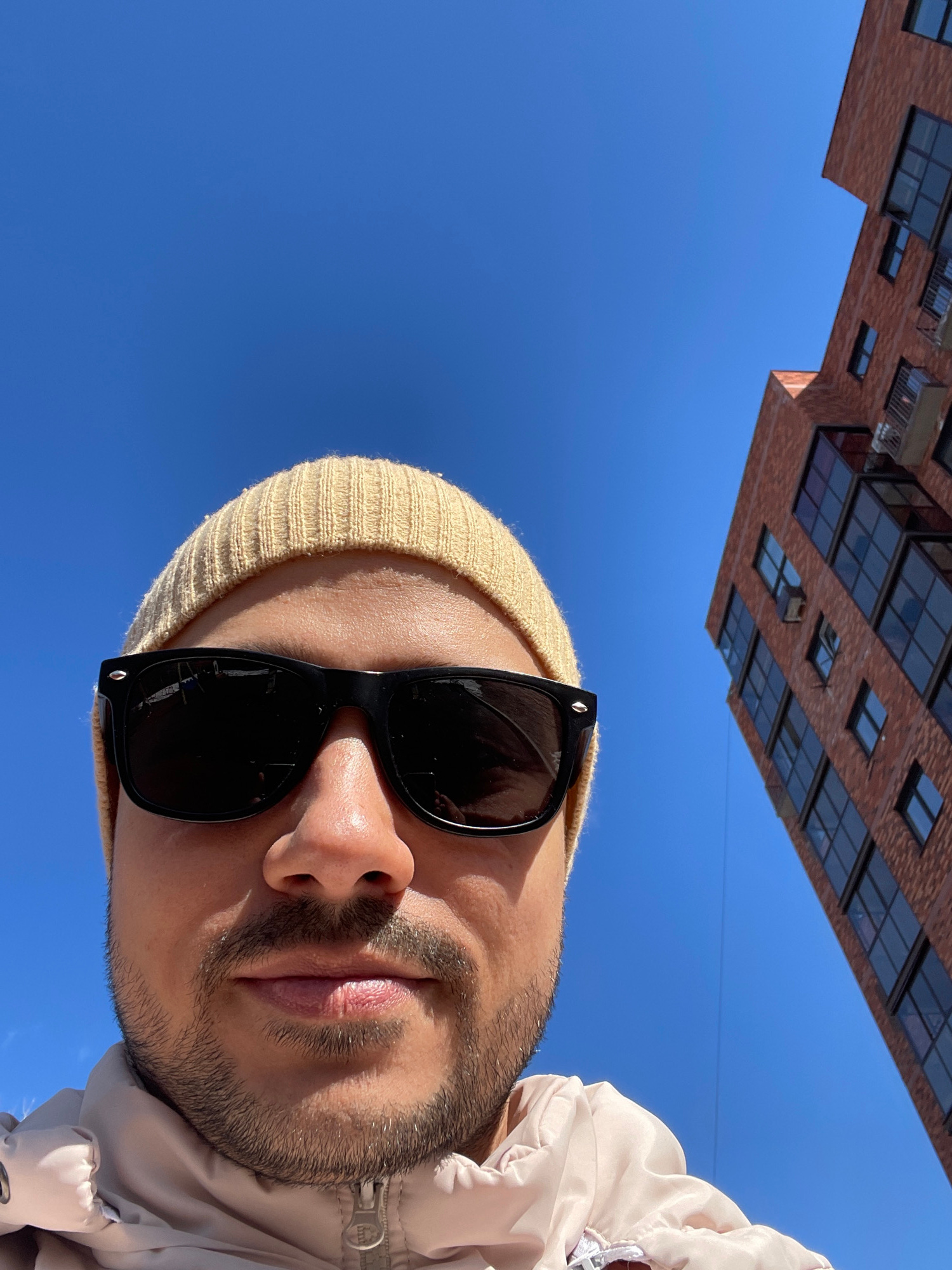 A low-angle selfie captures a person wearing a tan beanie and black sunglasses, with a glimpse of a beige jacket, set against a vivid blue sky. In the upper portion of the frame, a brick building with…read more