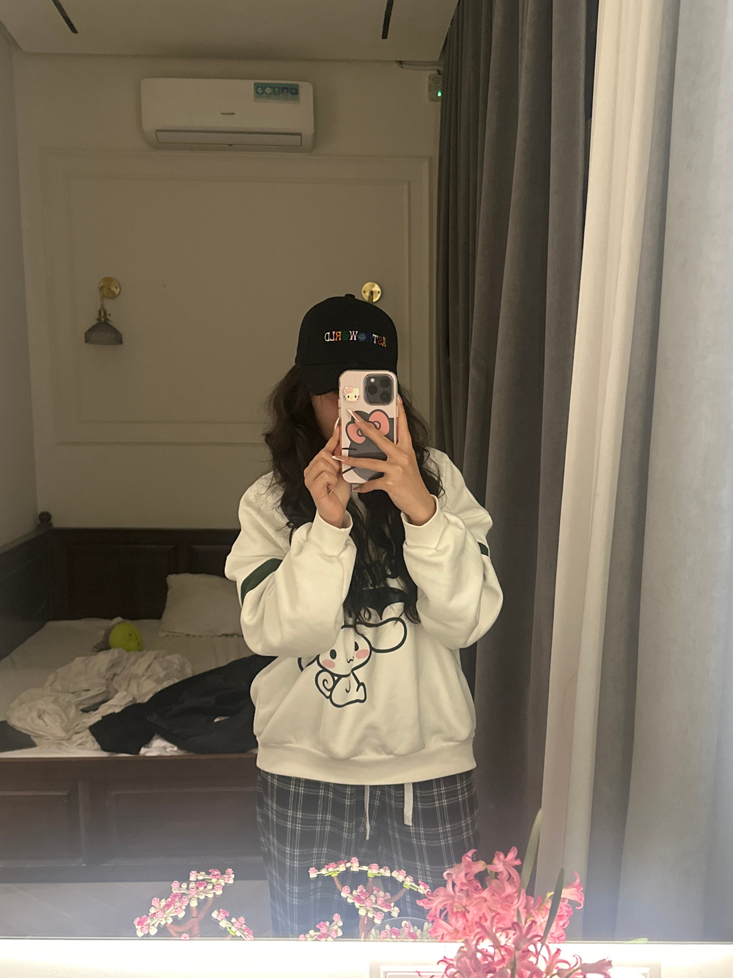 A person is reflected in a mirror. The person is wearing a black hat, a white sweatshirt with a cartoon image, and plaid pants. They are holding a phone with a patterned case, presumably taking a self…read more