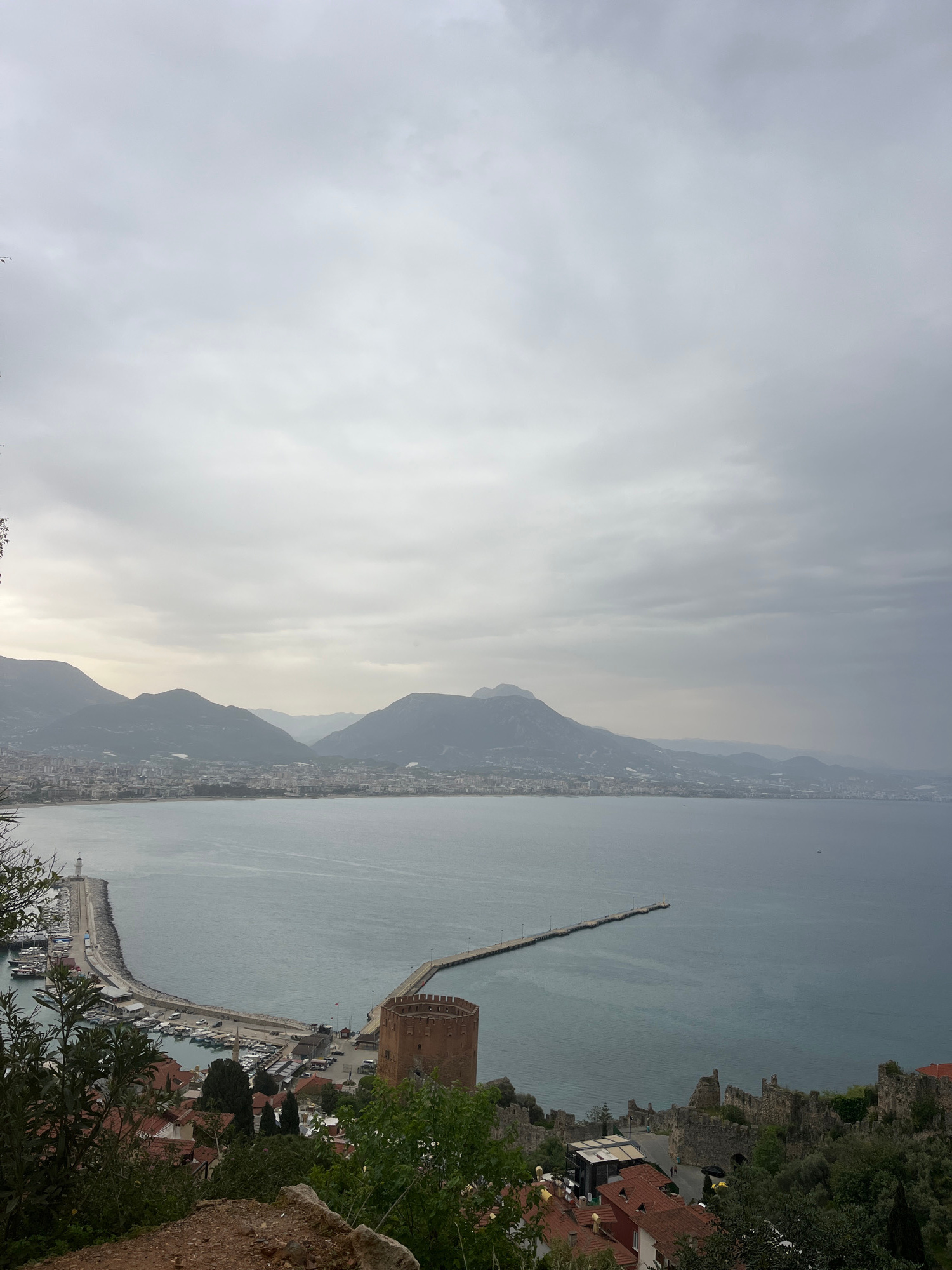 The image presents a panoramic view of a coastal city, likely Alanya, Turkey, captured from a high vantage point overlooking the sea. The sky is overcast and hazy, with soft, diffused light bathing th…read more