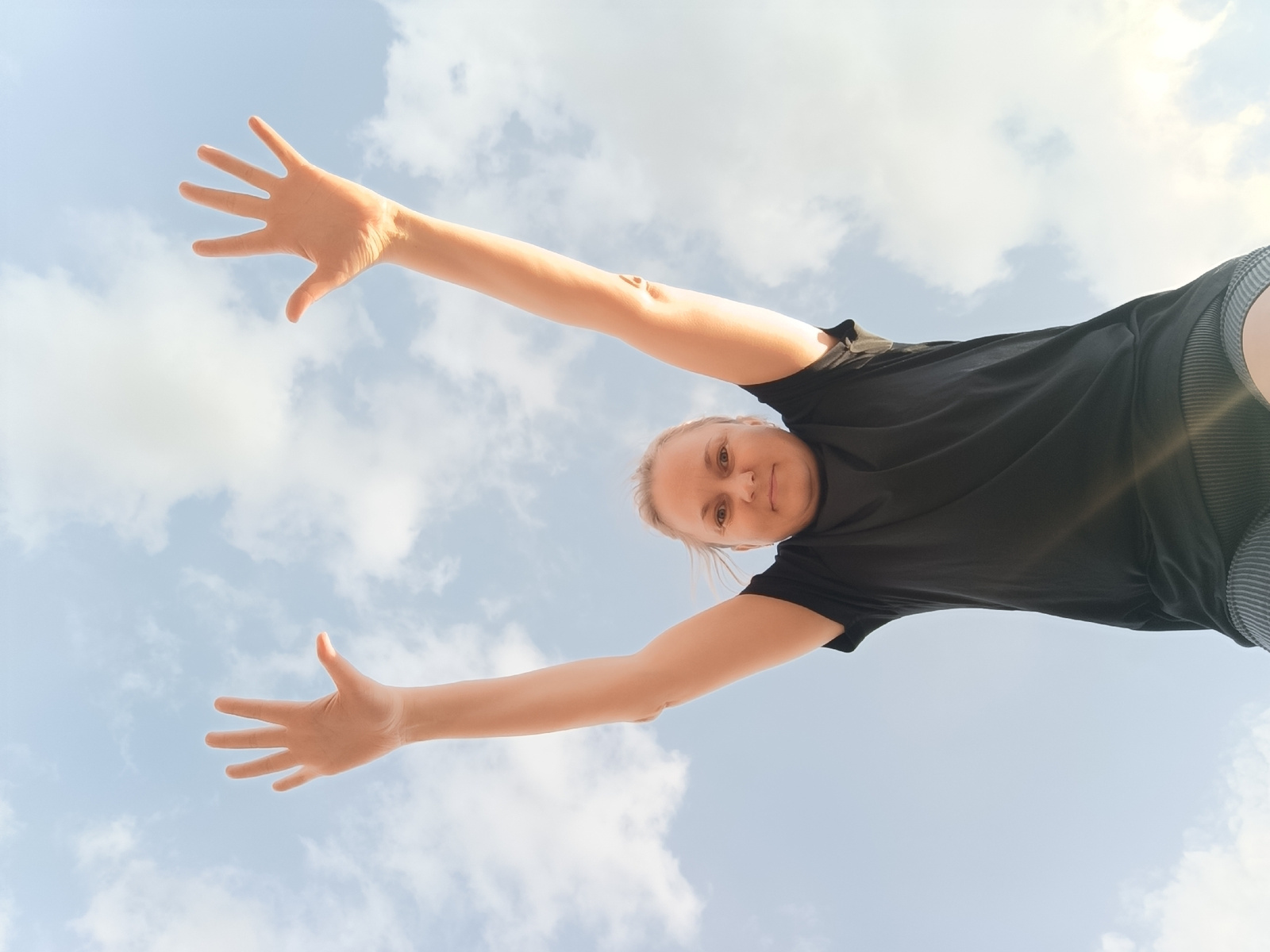 A low-angle shot depicts a woman from a worm's eye view against a backdrop of a partly cloudy, bright sky. The woman has fair skin and blonde hair pulled back. She wears a black t-shirt and dark short…read more