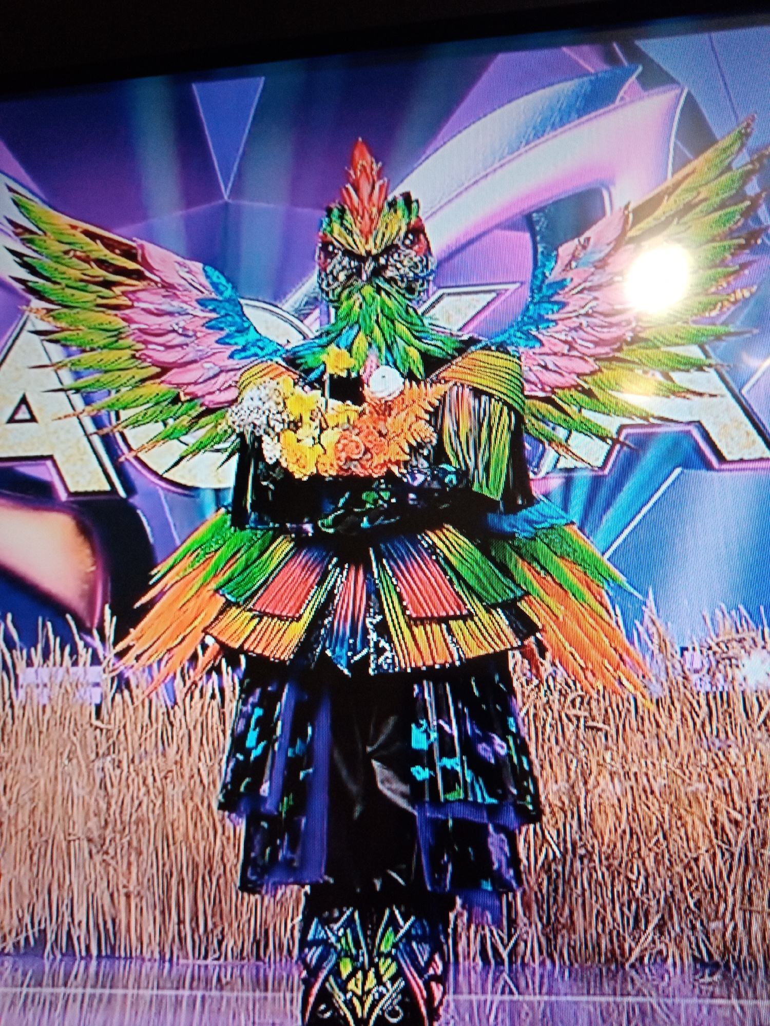 The image shows a figure in an elaborate, colorful bird costume standing on a stage. The costume has large, multicolored wings and feathered layers. The background includes abstract shapes, lights, an…read more
