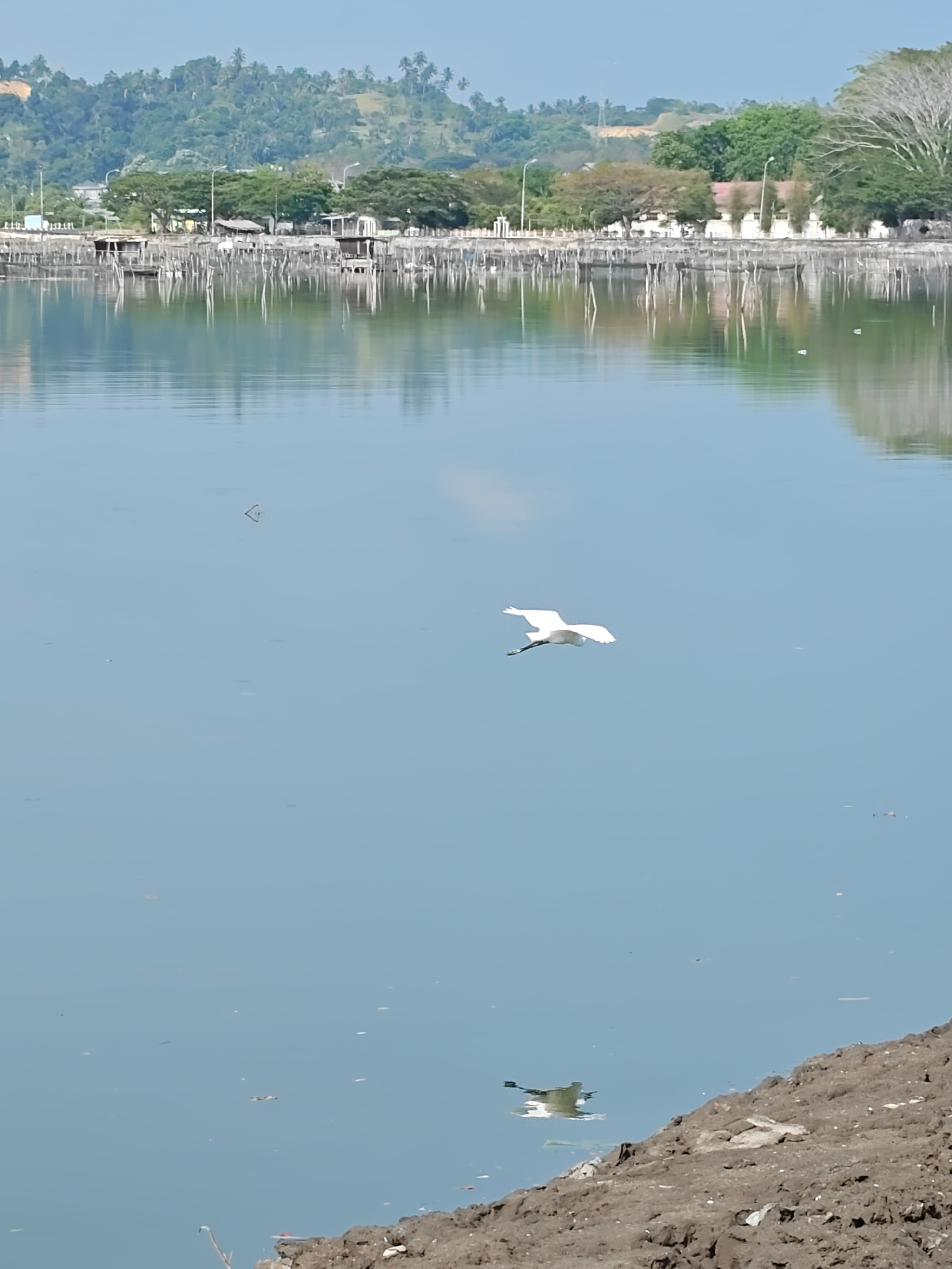 The image depicts a white bird in flight over a body of water. The water reflects the sky and some nearby structures, including a series of buildings and wooden structures. The shoreline is visible in…read more