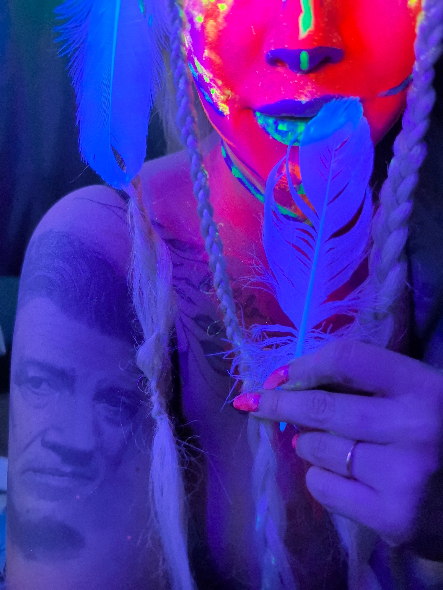 An artistic portrait taken under blacklight shows a person adorned with fluorescent paint and glowing objects. The subject's face and upper body are painted with vibrant neon pink, green, and blue col…read more