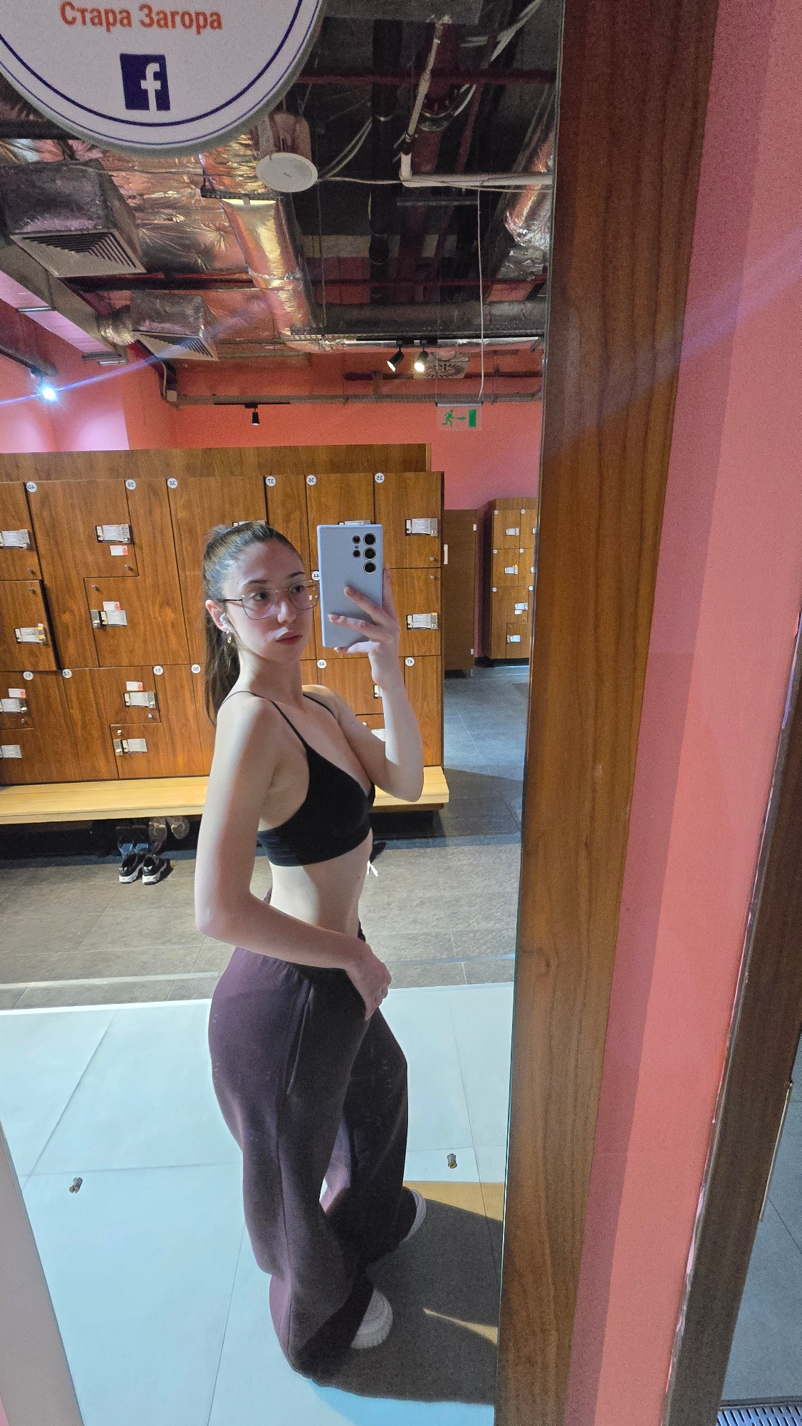 A woman in a black sports bra and dark-colored sweatpants stands in front of a mirrored wall in what appears to be a locker room. She is holding a phone and taking a selfie. Behind her are wooden lock…read more