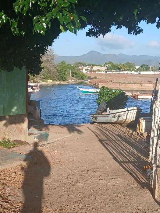 A scenic view shows a body of water flanked by lush greenery and distant mountains under a blue sky. A small boat rests on a dirt path adjacent to the water. Part of a building with a green wall is vi…read more
