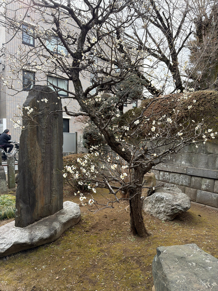 A leafless tree with small white blossoms spreads its branches amidst a stone garden. A weathered stone monument stands upright, etched with inscriptions. Two figures, one possibly on a bicycle, are p…read more