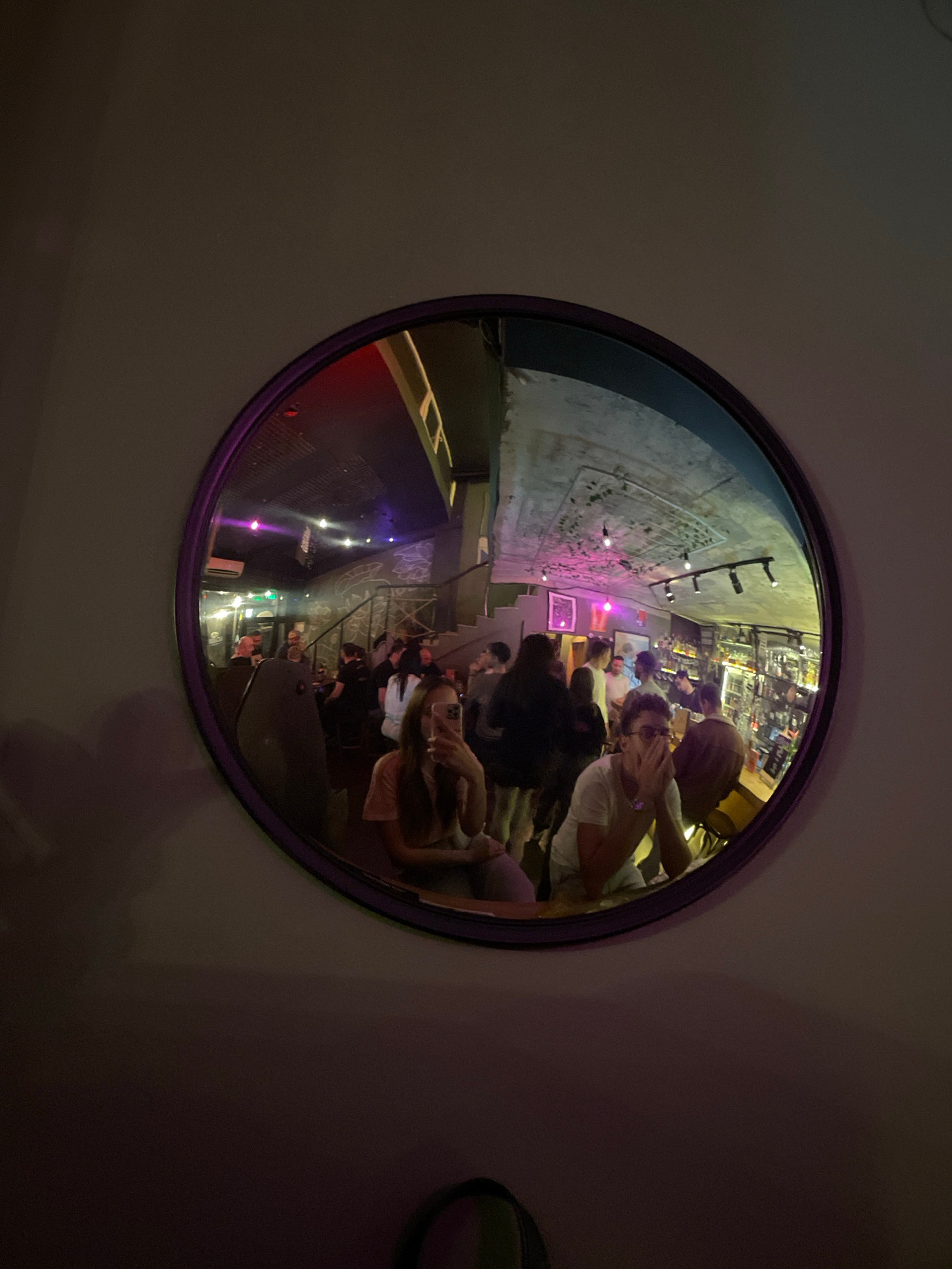 The image shows the reflection of a bar in a round mirror. The bar is crowded with people sitting and standing. The mirror is mounted on a white wall. The overall lighting is dim. It is not possible t…read more