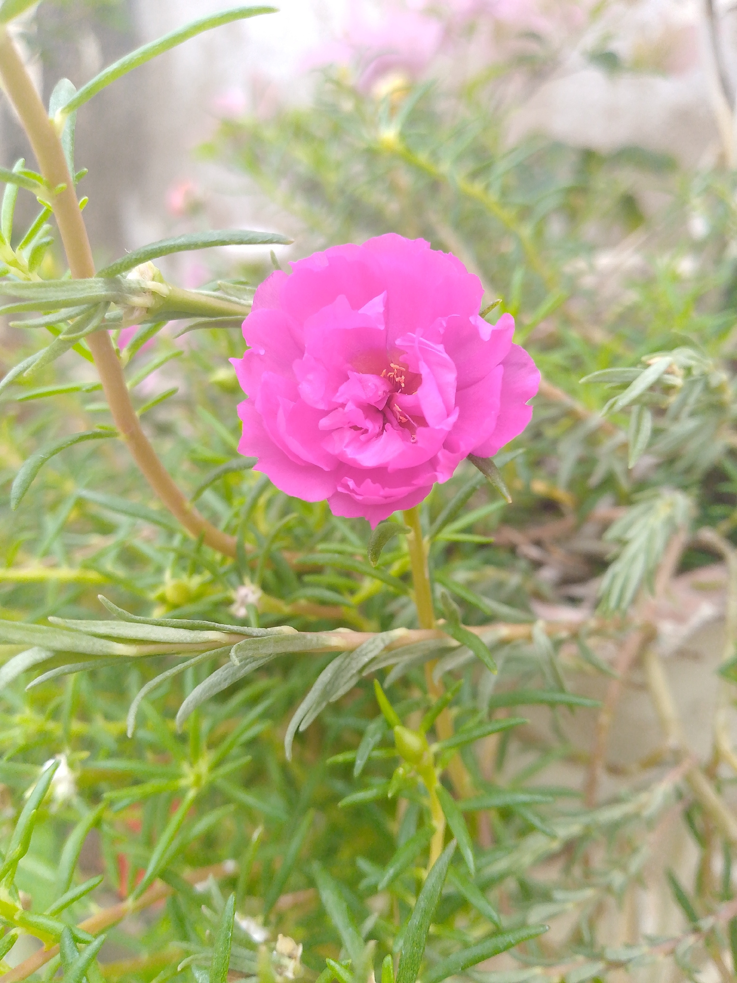 The image shows a vibrant pink flower in full bloom, surrounded by green, needle-like foliage. The plant appears to be outdoors, likely in a garden or similar setting. The location is stated to be Tin…read more