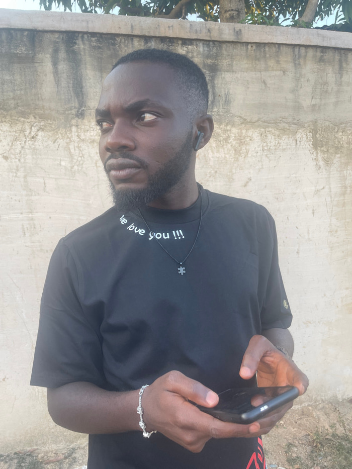 A man holds a mobile phone in his hands. He wears a black T-shirt with white lettering. The phrase "we love you!!!" appears near the neckline. A silver necklace with an unusual pendant and a silver br…read more