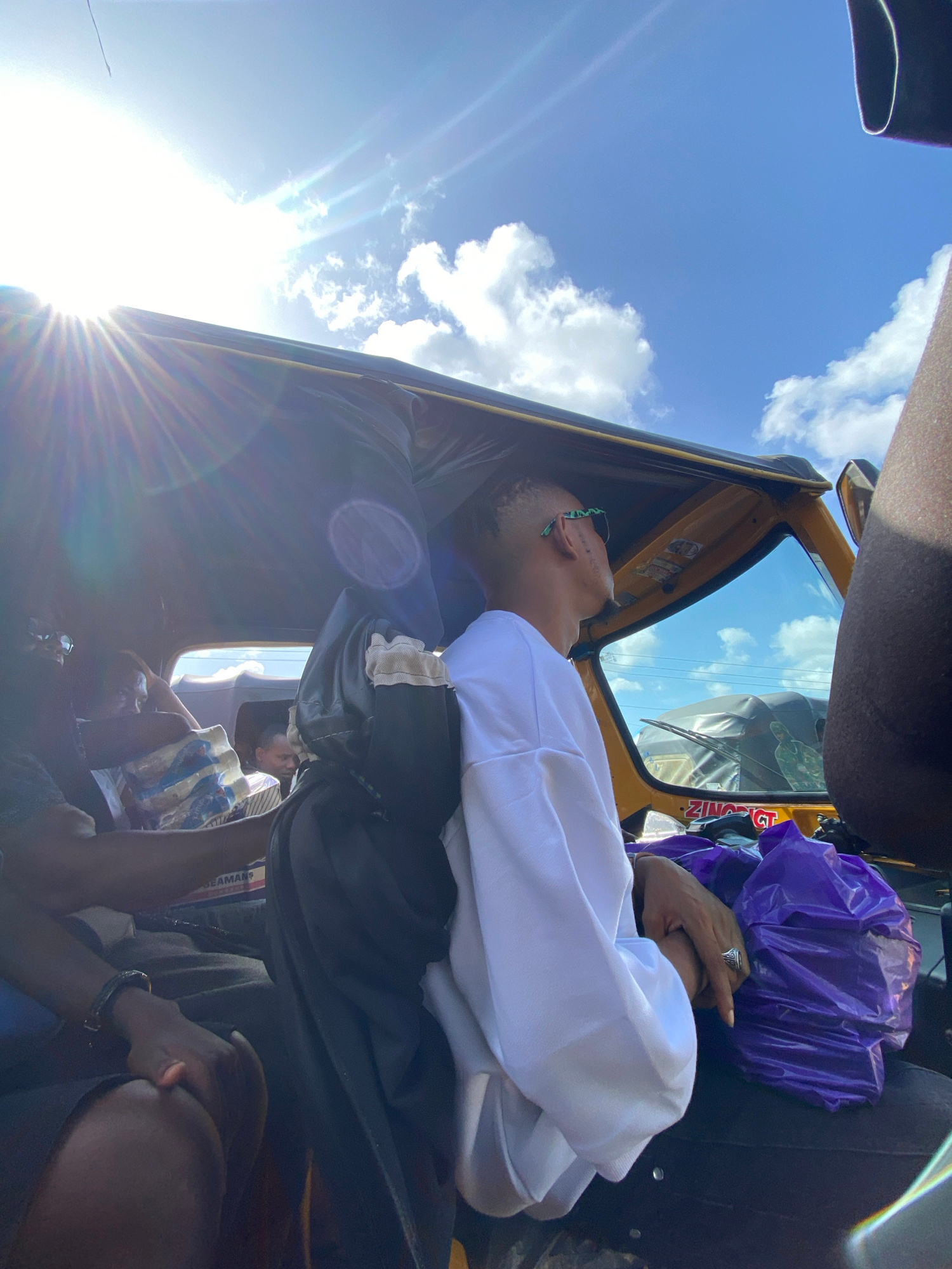 The image shows the interior of a yellow commercial tricycle, often called a "Keke" or "Maruwa," in Lekki, Nigeria, under a bright, sunny sky with scattered clouds. The angle suggests the photo was ta…read more
