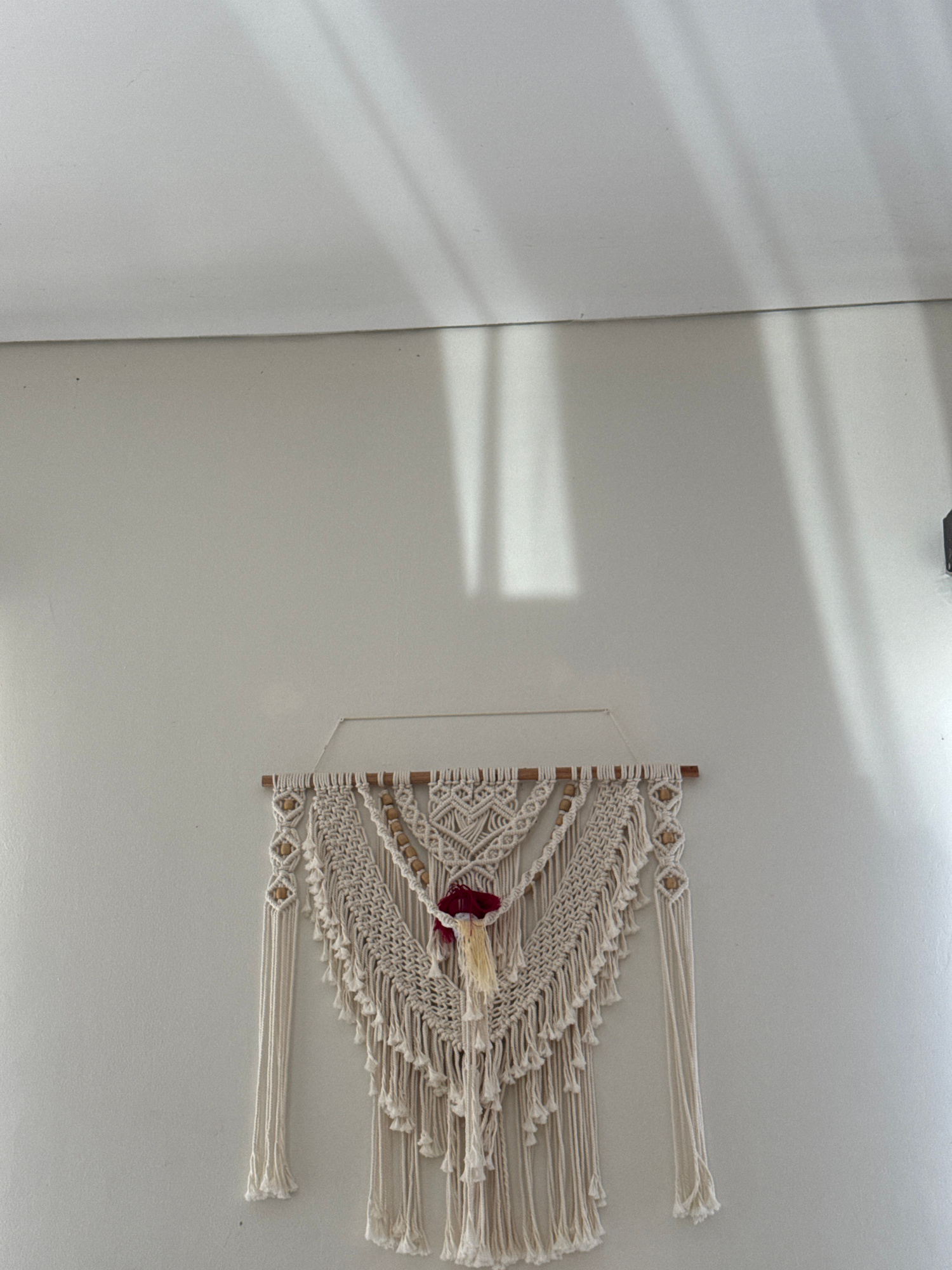 A macramé wall hanging with white cords and wooden beads, adorned with a red and tan tassel in the center, is mounted on a light-colored wall. The wall is illuminated by diffused light with visible sh…read more