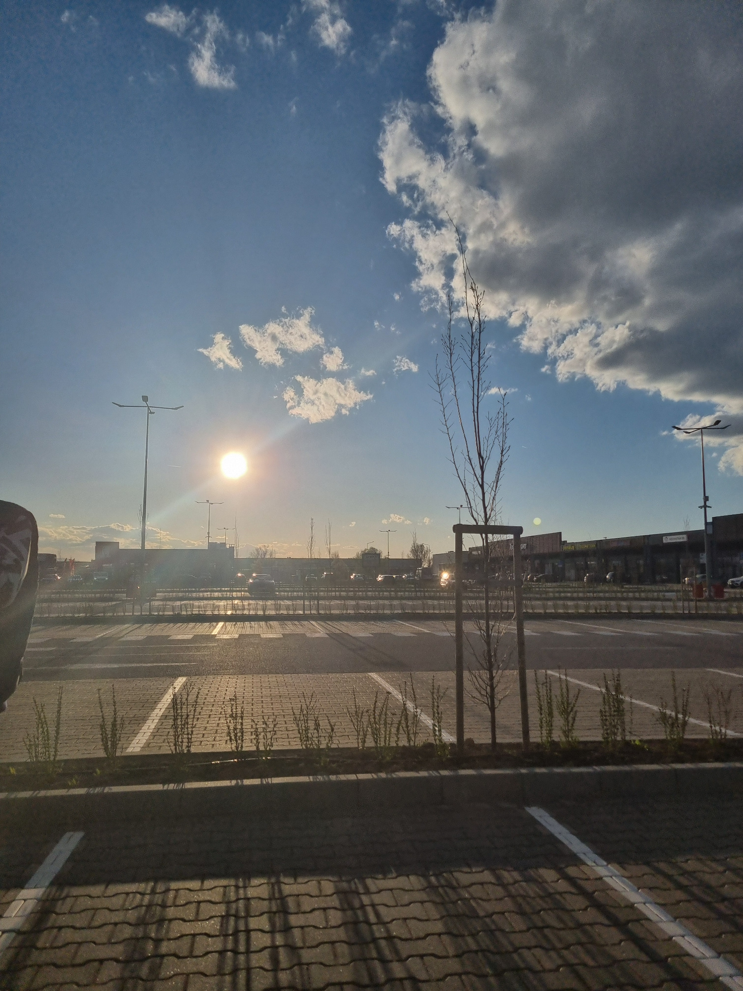 The image depicts a sunlit urban landscape, likely a parking lot in Sofia, Bulgaria. The sky is partly cloudy with the sun shining brightly. In the foreground are parking spaces demarcated by white liβ¦read more