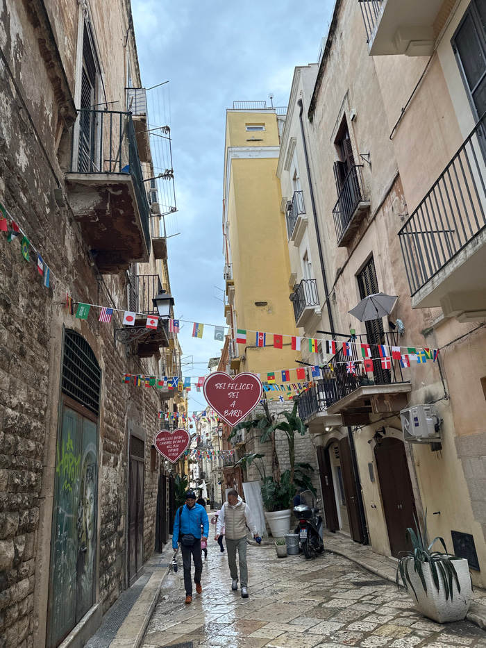 This image depicts a narrow, wet, stone-paved alley in Bari, Italy, likely in the historic old town, given the "SEI FELICE? SEI A BARI!" signs. The sky above is overcast. On the left, multi-story bui…read more