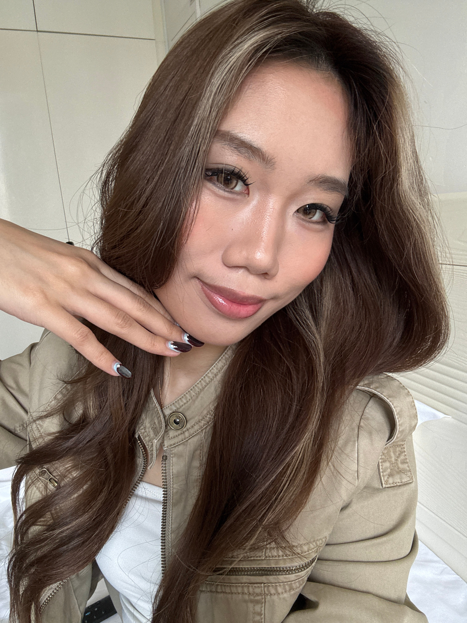 A woman lies down, facing the camera. She has long brown hair with blonde highlights and light skin. She is wearing a beige jacket over a white shirt. Her right hand is resting on her cheek. Her nails…read more