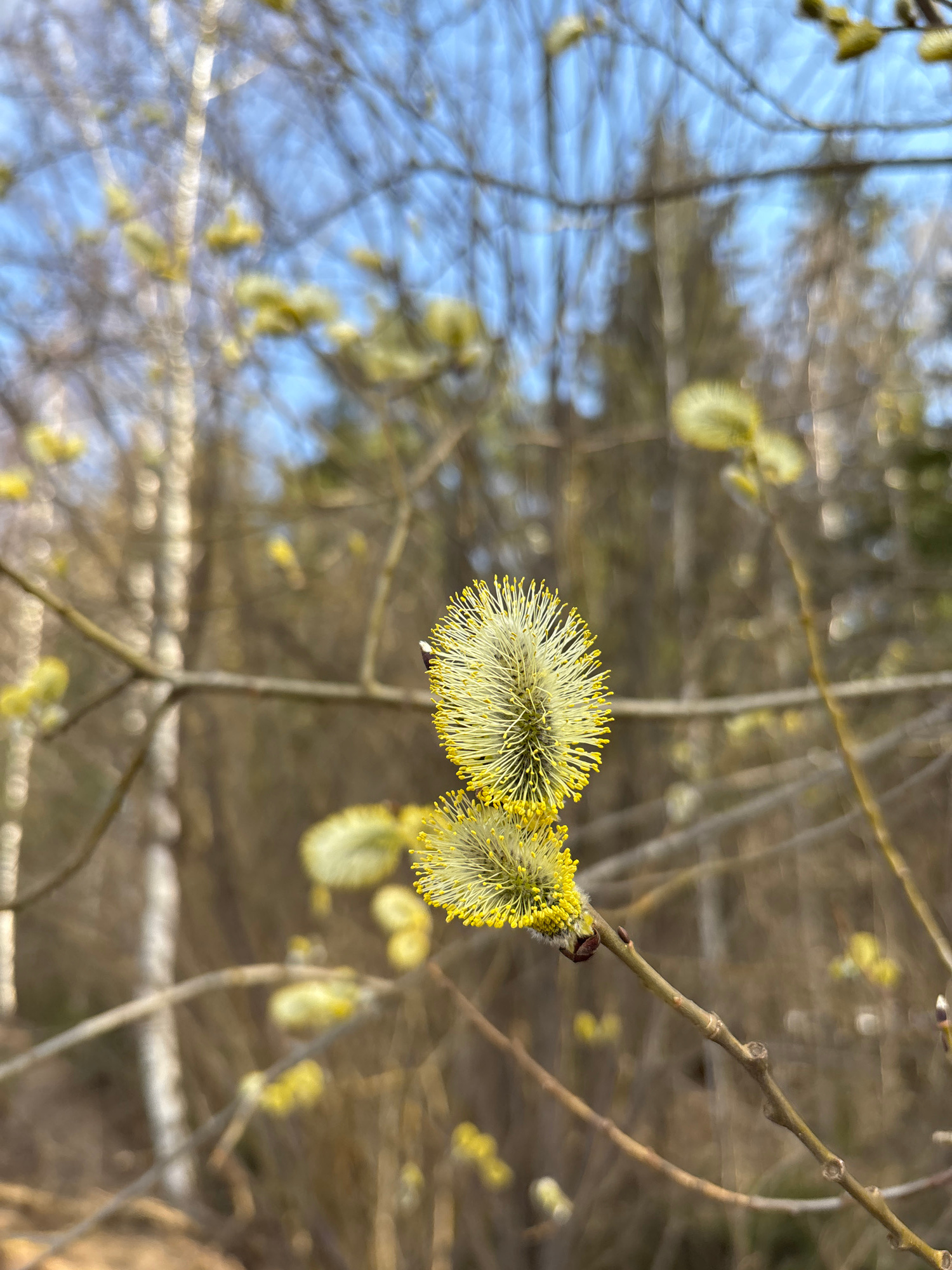 A close-up photograph captures several vibrant yellow pussy willow catkins blooming on bare tree branches. Two prominent catkins in the mid-ground are in sharp focus, displaying their distinctive fuzz…read more