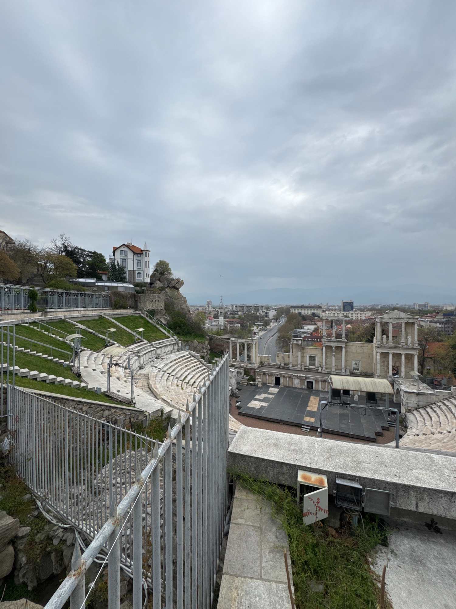 The image shows a high-angle view of the Ancient Theatre of Philippopolis in Plovdiv, Bulgaria, with a section of the surrounding city visible in the background under a cloudy sky. The theater's seatiβ¦read more