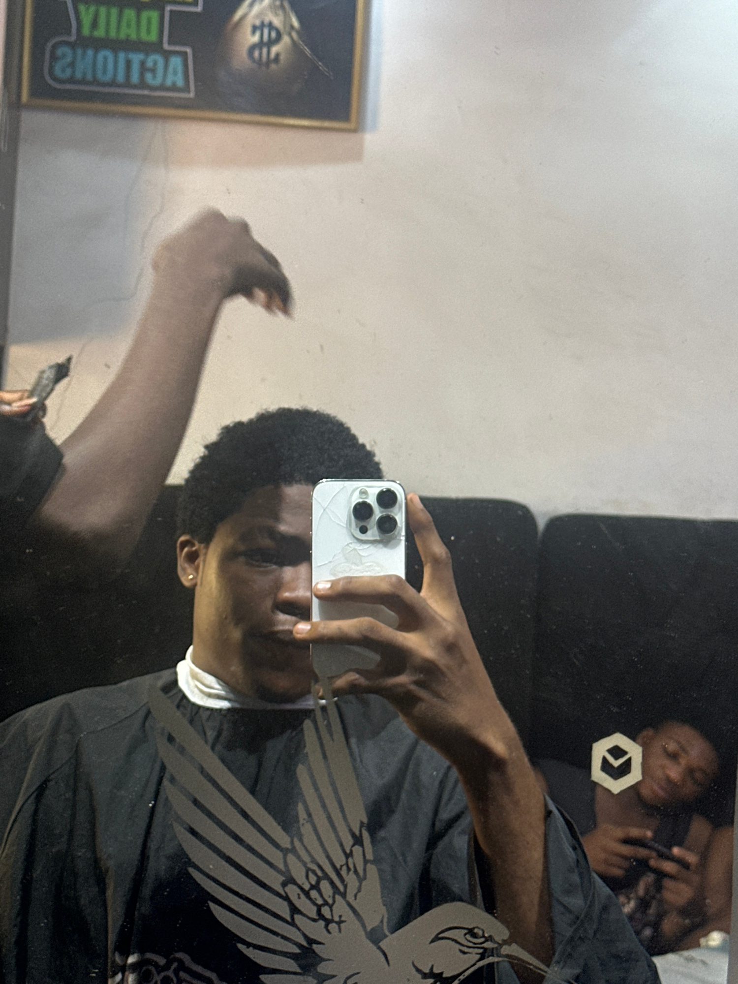 A mirror selfie captures a young Black male with short, dark, curly hair, holding a silver smartphone with a cracked screen protector. He is wearing a dark garment over a white high-neck top and has a…read more