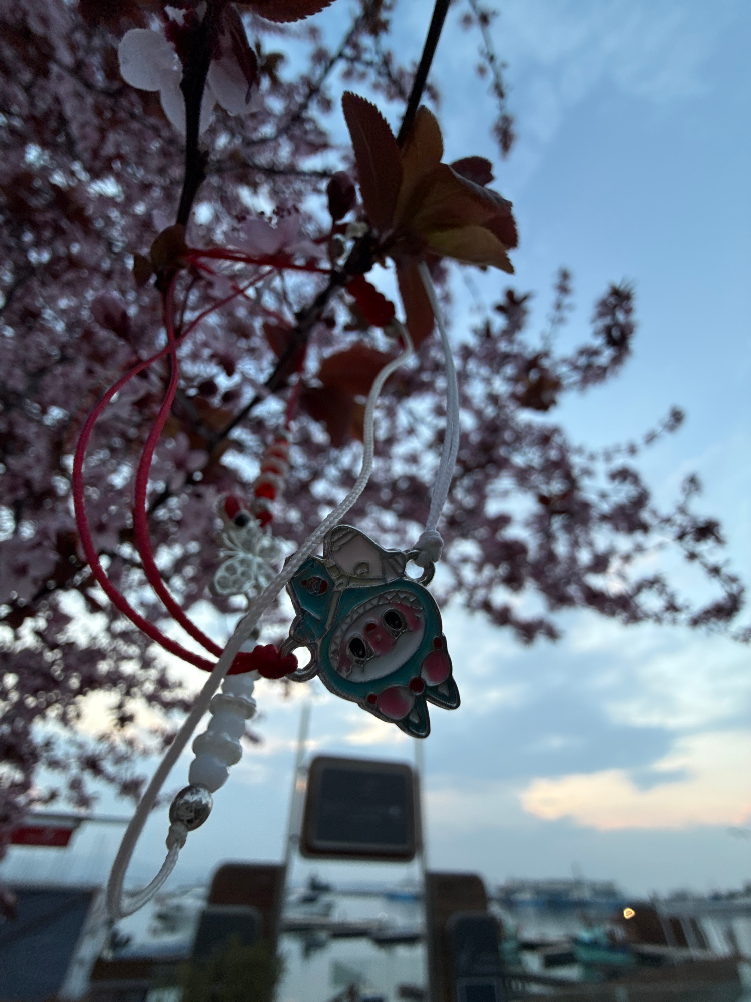 A close-up outdoor shot in Sozopol, Bulgaria shows a traditional Bulgarian Martenitsa charm hanging on a blossoming tree branch, with the city visible in the background. The Martenitsa features a car…read more