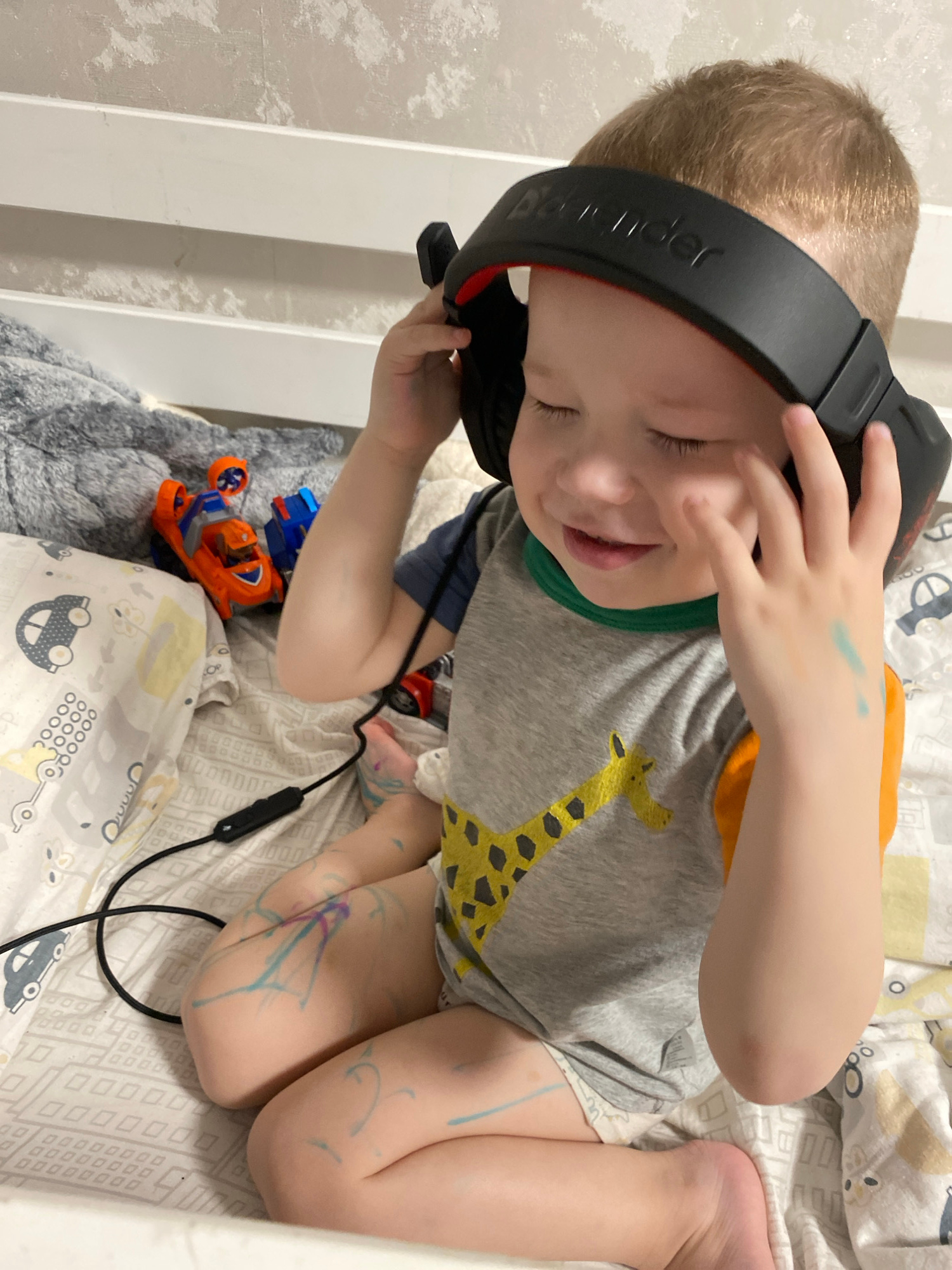 A young boy is lying on a bed with car-patterned sheets, wearing a grey t-shirt with a giraffe design and headphones with the word "Defender" visible. He has marker scribbles on his legs and hands. Th…read more