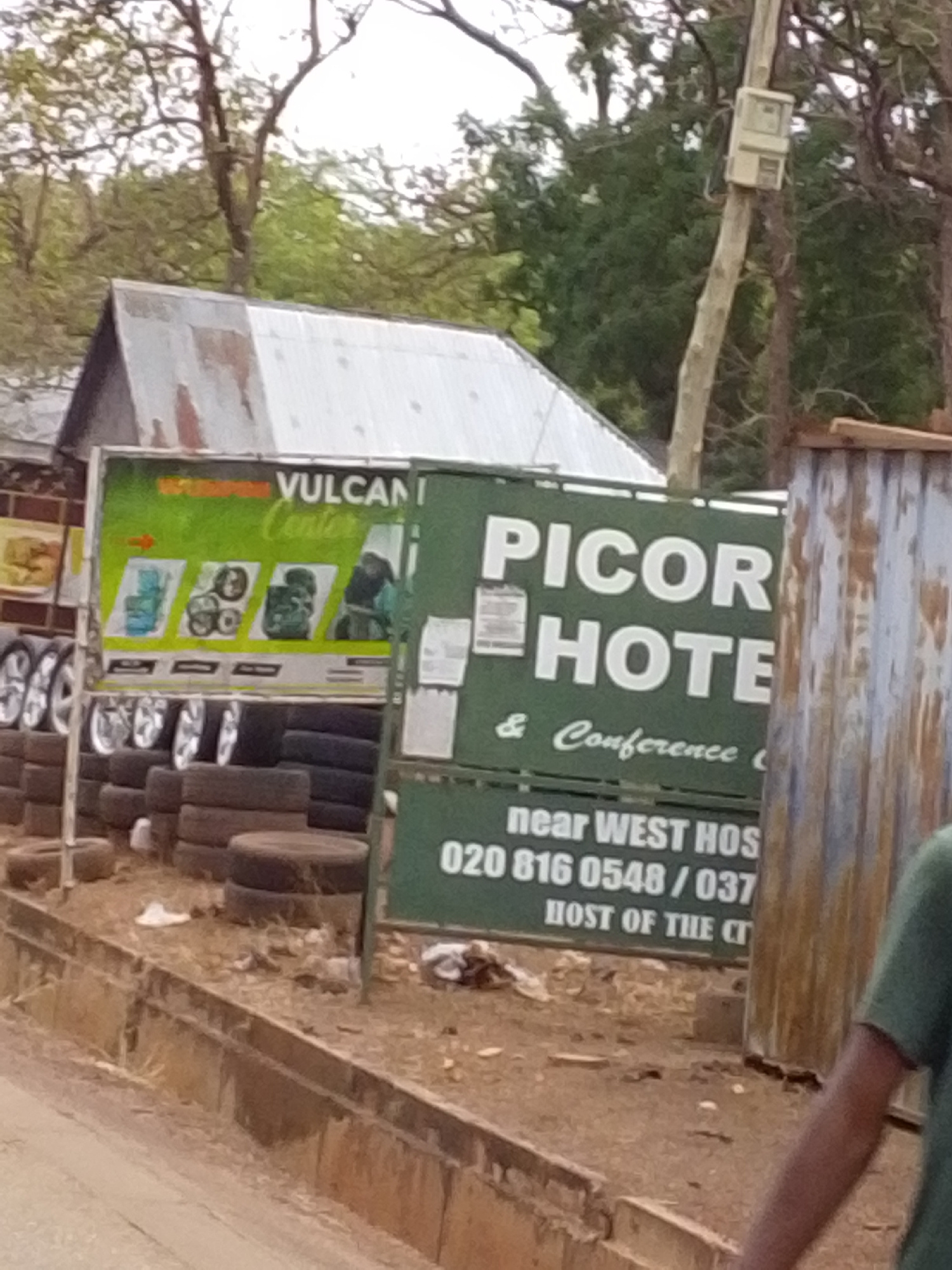 The image shows a roadside scene in Tamale, Ghana. A sign for "Vulcan Center," a vulcanizing shop offering tire repair services, stands next to a sign for "Picor Hotel & Conference Center." A stack of…read more